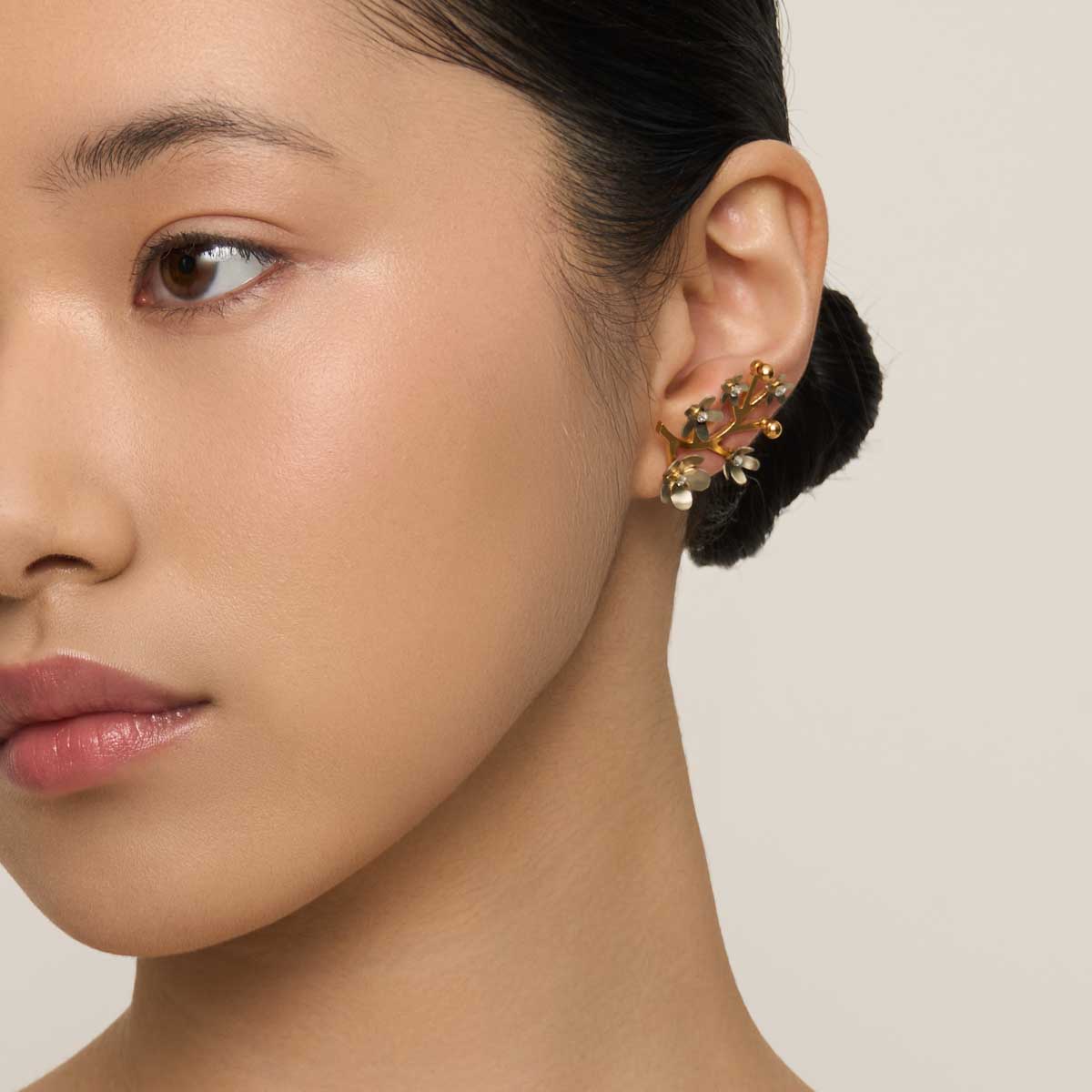 Each gold-plated brass branch features cherry blossoms of varying sizes. The flowers are formed from alpaca, a metal with a cool, silvery sheen, which paired with the gold-plated branch creates a classic combination. The petals are twisted with tiny jewelry screws, much like origami, giving them a geometric, precise, and distinctive character rather than a soft, romantic look. The stamens are made of gold-plated brass, adding lightness and brilliance, and each flower center holds a sparkling synthetic crystal. The earrings are asymmetrical, reflecting the natural, irregular arrangement of branches and flowers, which never bloom identically. They are handmade in our workshop and fasten with comfortable silver studs. One earring features a decorative dangling chain with a small gold-plated silver bead, which can be removed to wear the earring alone or attached to another earring.