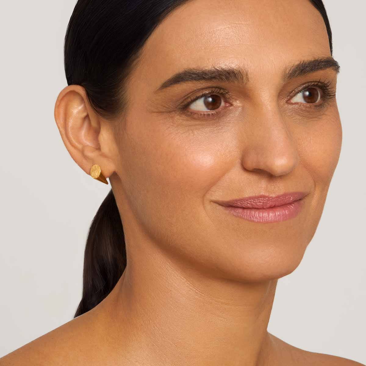 The earrings are handmade from gold-plated brass in the form of small cone-shaped studs. The sides of the cones have a satin, matte finish, while the tops have a brushed, textured surface. This intriguing play of textures, characteristic of many designs in the Guatemala collection, subtly reflects light and brightens the face. They are also available in a silver color version.