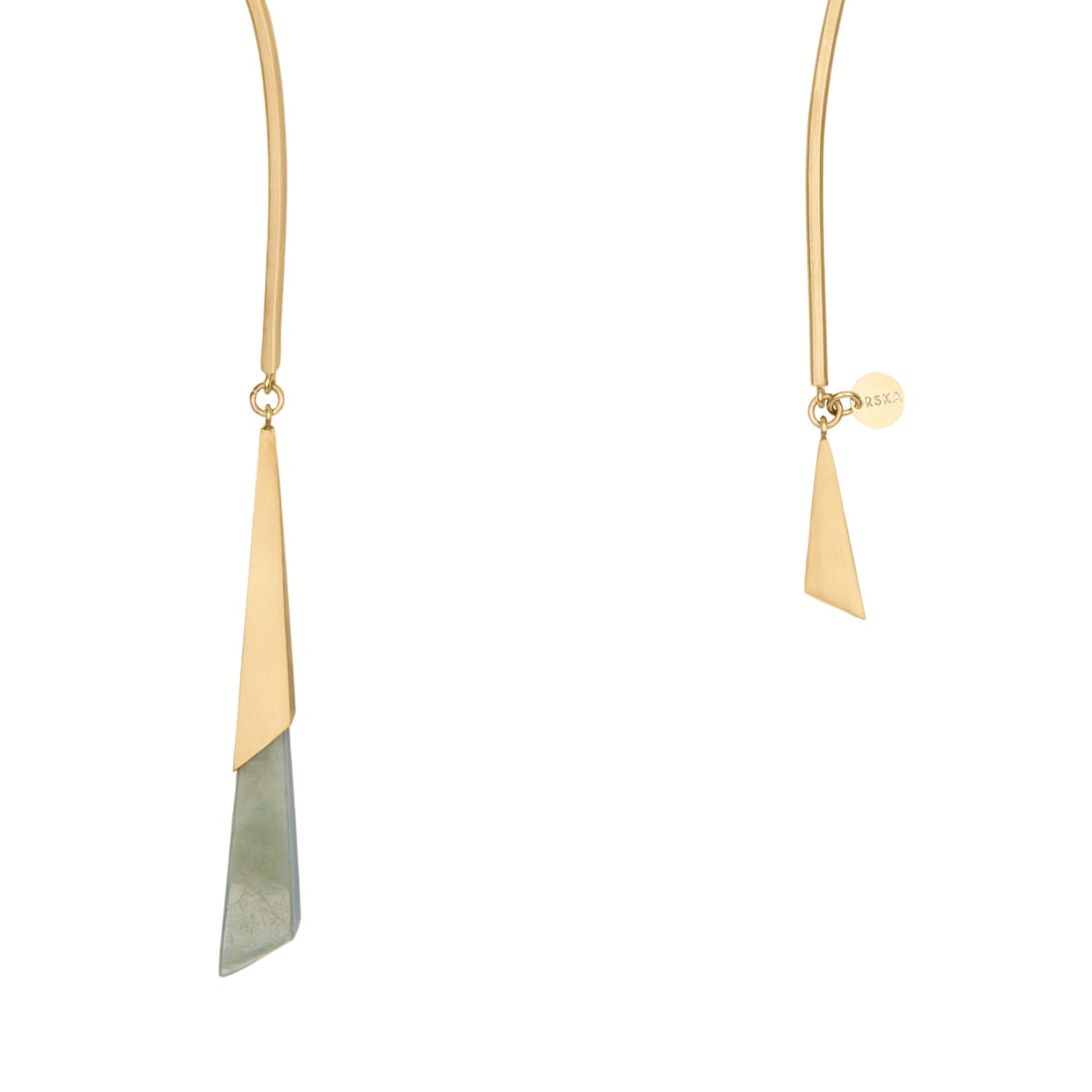 The collar is handcrafted from gold-plated brass in a rigid, asymmetrical design that sensually wraps around the neck and decorates the décolleté. On one side, the collar ends with a gold-plated brass pyramid-shaped pendant, and on the other side with a large, geometric pendant featuring light green jade. The metal is shaped to subtly follow the line of the neck, forming an elegant, sculptural composition that draws attention and adds character to your outfit. This jewelry is designed for special occasions – evening events, elegant dinners, or any moment when you want to look exceptional.