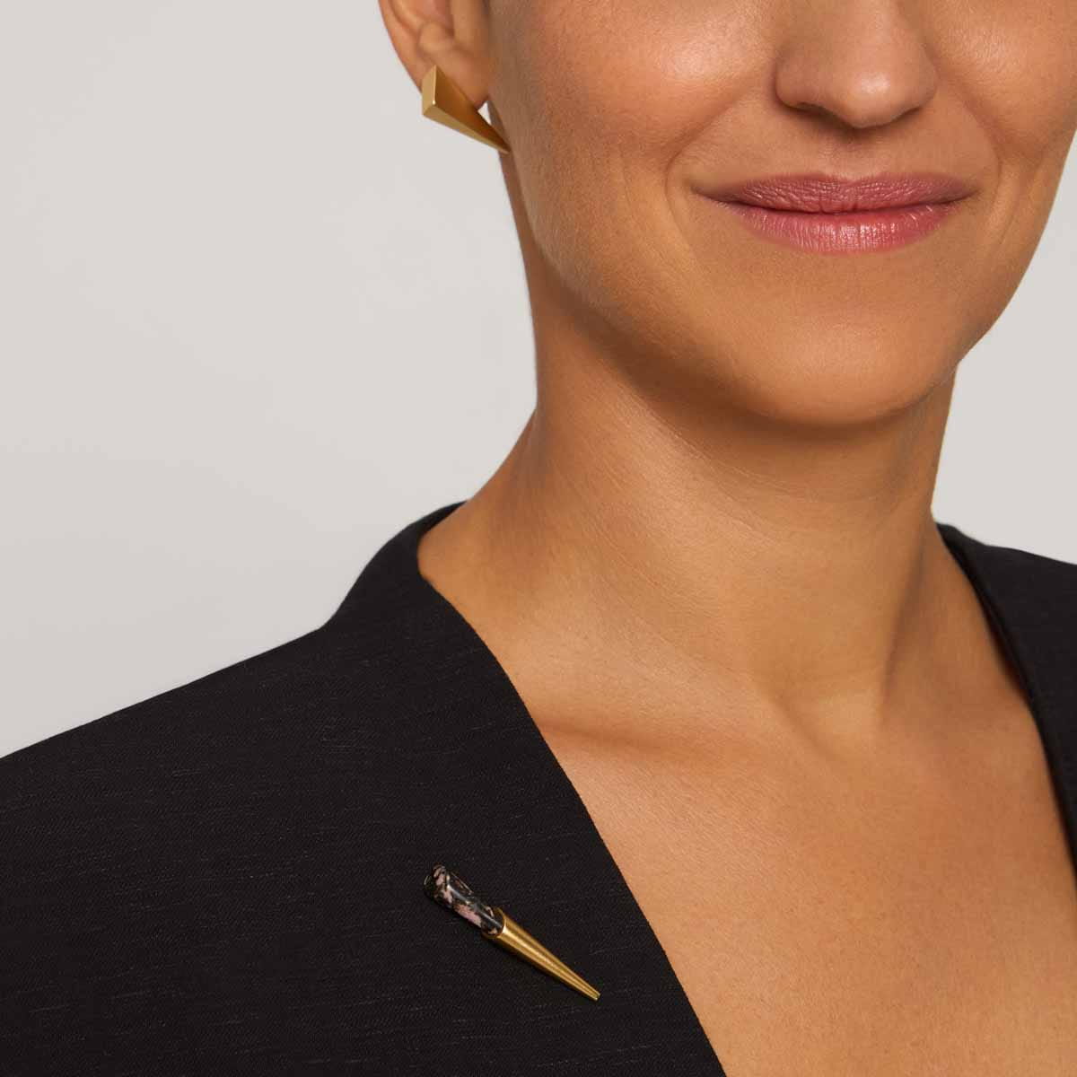 The pin is handmade from gold-plated brass in a cone shape. From the midpoint of the pin, a satin-finished metal embraces a jade in a unique speckled pink color. The stone features delicate dark and pink spots, creating a one-of-a-kind pattern. Each pin is unique, as natural jade varies in shade from piece to piece. The pin’s convenient clasp allows it to be worn on a blazer lapel, shirt collar, bag, scarf, or a Guatemala collection kimono — anywhere you want to add a subtle jewelry accent.