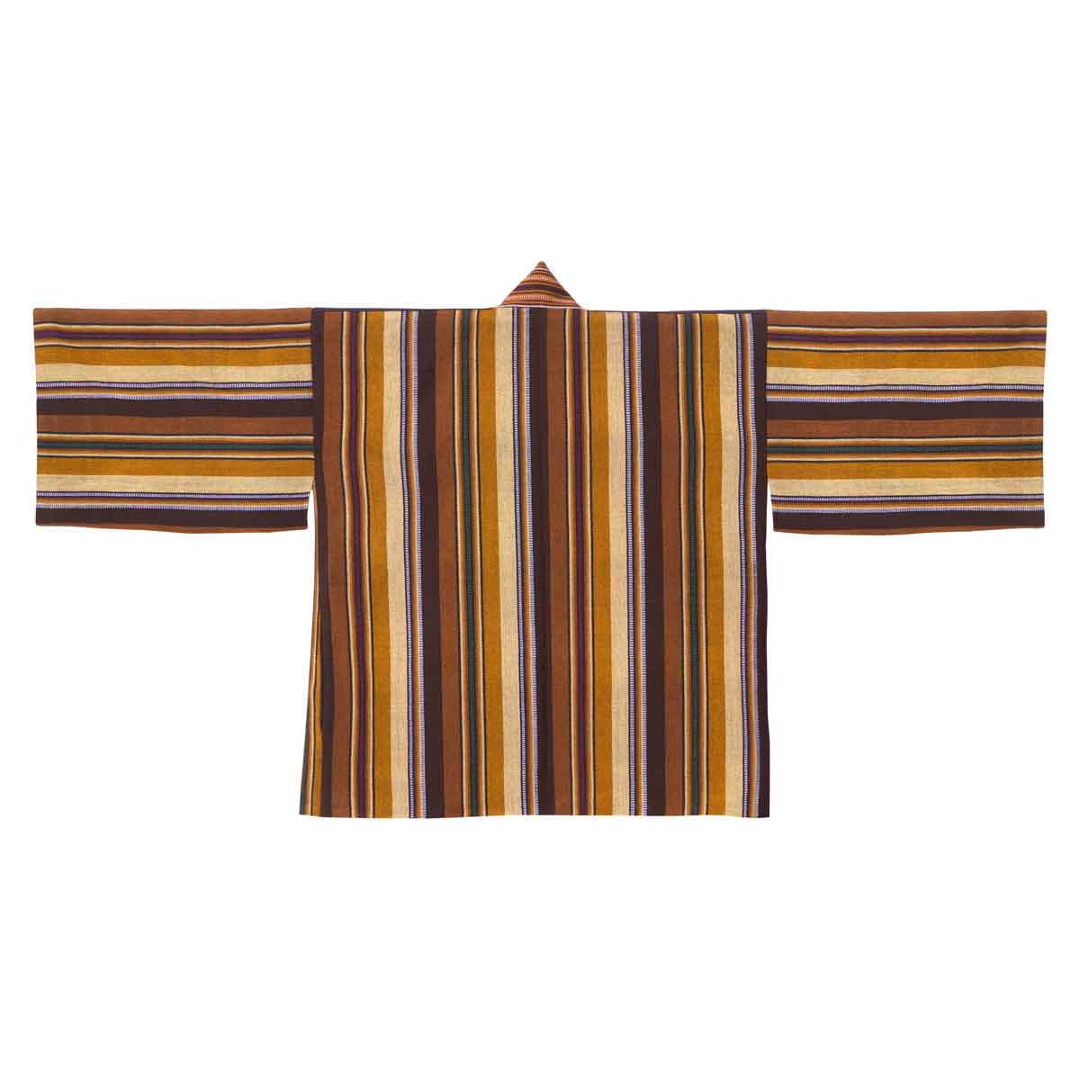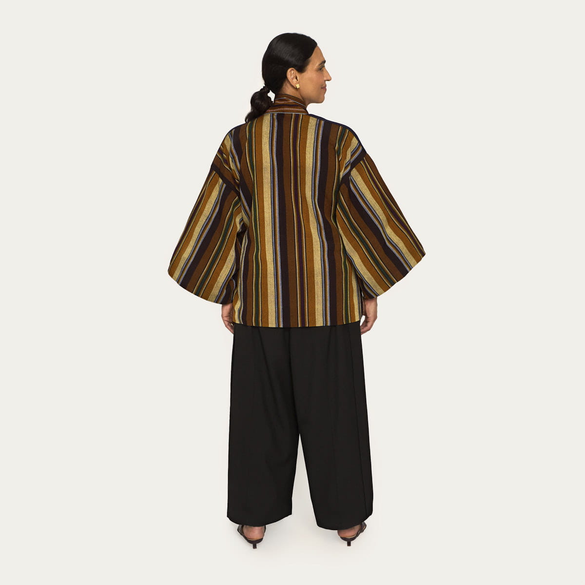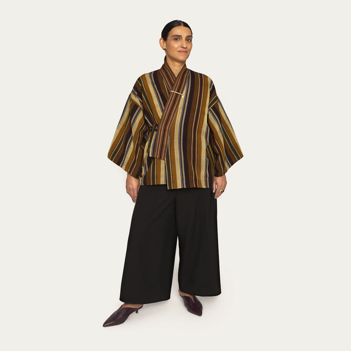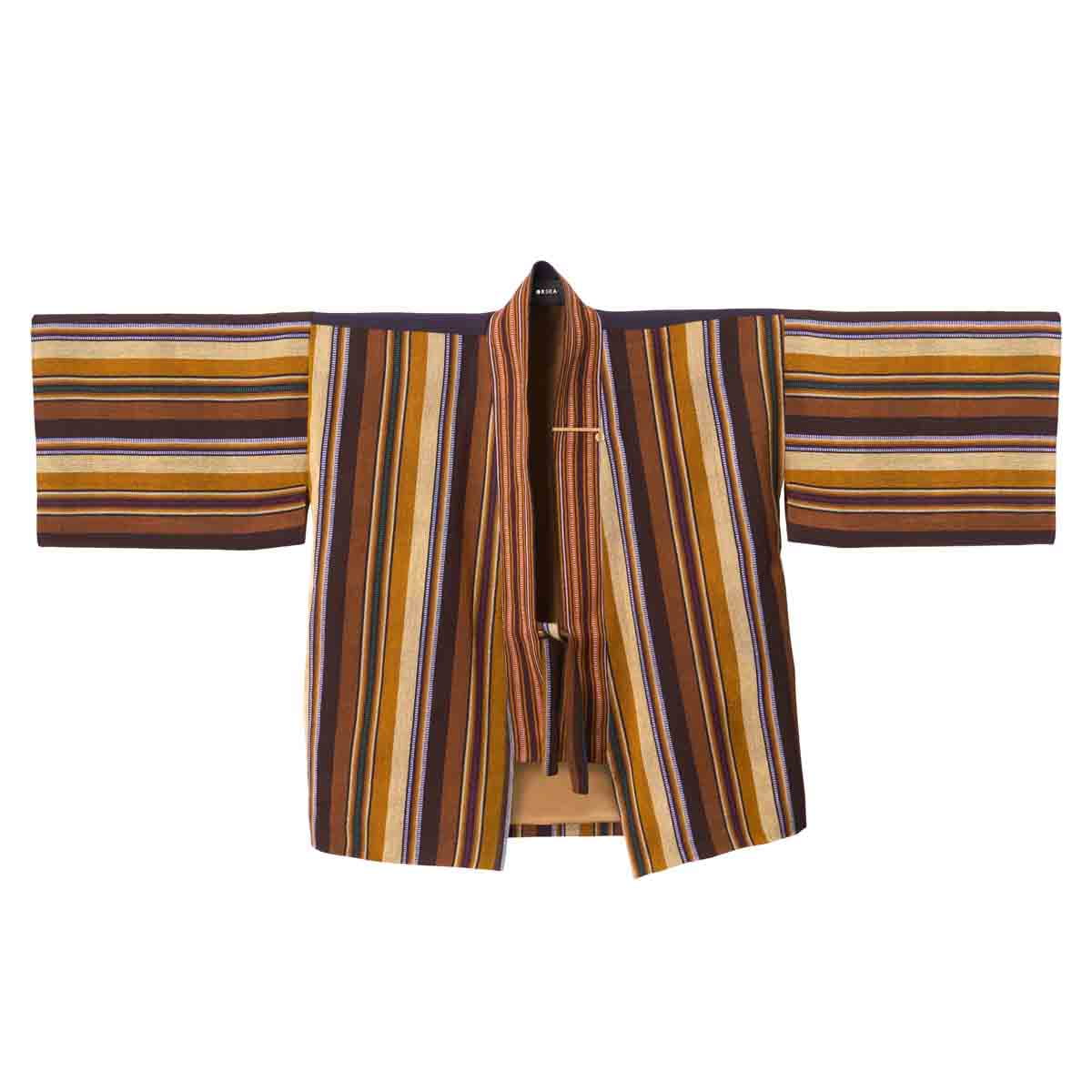 This kimono is made from Guatemalan striped fabric, primarily in shades of brown, with occasional stitching in blue and red, adding depth and character. The fabric was dyed and woven in Chichicastenango, then brought to the Polish studio where the kimono was sewn in a minimalist design. It features wide sleeves and a tie closure, allowing for a comfortable fit. The kimono is made in a universal size that beautifully suits both S and XL. The inside is finished with a colorful brown lining, made with a less-waste approach. Each kimono comes with an elegant gold-plated brass pin bearing the ORSKA logo. As a limited piece, each kimono is unique – no two are exactly alike, even due to subtle differences in lining color.