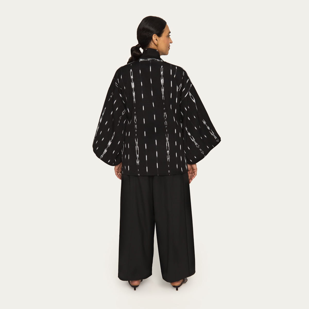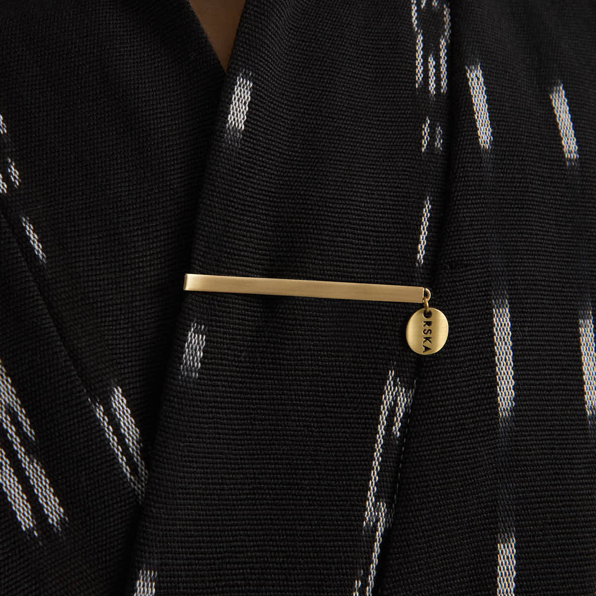 The kimono is made from Guatemalan fabric in an intense black, decorated with white ornaments forming a graphic, striking pattern. The fabric was dyed and woven in Chichicastenango and then brought to the Polish workshop, where it was crafted into a kimono with a minimalist, geometric form. The kimono features wide sleeves and a tie closure, allowing it to fit comfortably to the wearer’s silhouette. It is made in a universal size, fitting beautifully from S to XL. The interior features a colorful fuchsia lining, providing a surprising, energetic contrast to the black-and-white exterior and following a less-waste approach. The kimonos are limited edition, and each set includes an elegant ORSKA logo brooch made of gold-plated brass. This is not just a garment but a collectible piece. Each kimono is slightly unique – no two are exactly the same, partly due to the less-waste lining choices.