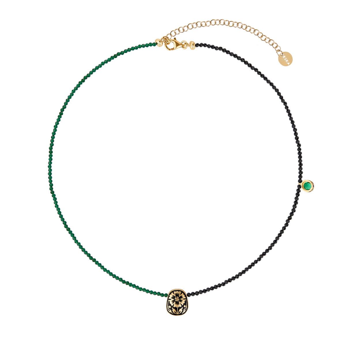This short necklace was created in the ORSKA studio from gold-plated silver and colored stones. Half of the necklace is made of dark green cubic zirconia, the other half of faceted black onyx. The stones are connected in the center by a decorative pendant, decorated on all sides, made in Rajasthan by friendly artisans whom Anna Orska met during her design trip to India. One of the pendants features a central black kundan glass, traditional Indian glass, surrounded by gold-plated silver and black enamel embellishments. A black and gold ornament in the form of a marigold flower is painted on the reverse. The necklace is asymmetrical – on its side, between the onyx stones, an additional pendant is strung, with a central green kundan glass pendant, the setting of which is covered with intricate green-and-blue enamel decorations. The asymmetry gives the necklace an artistic, unconventional character. This jewelry is for those who are not afraid to stand out.