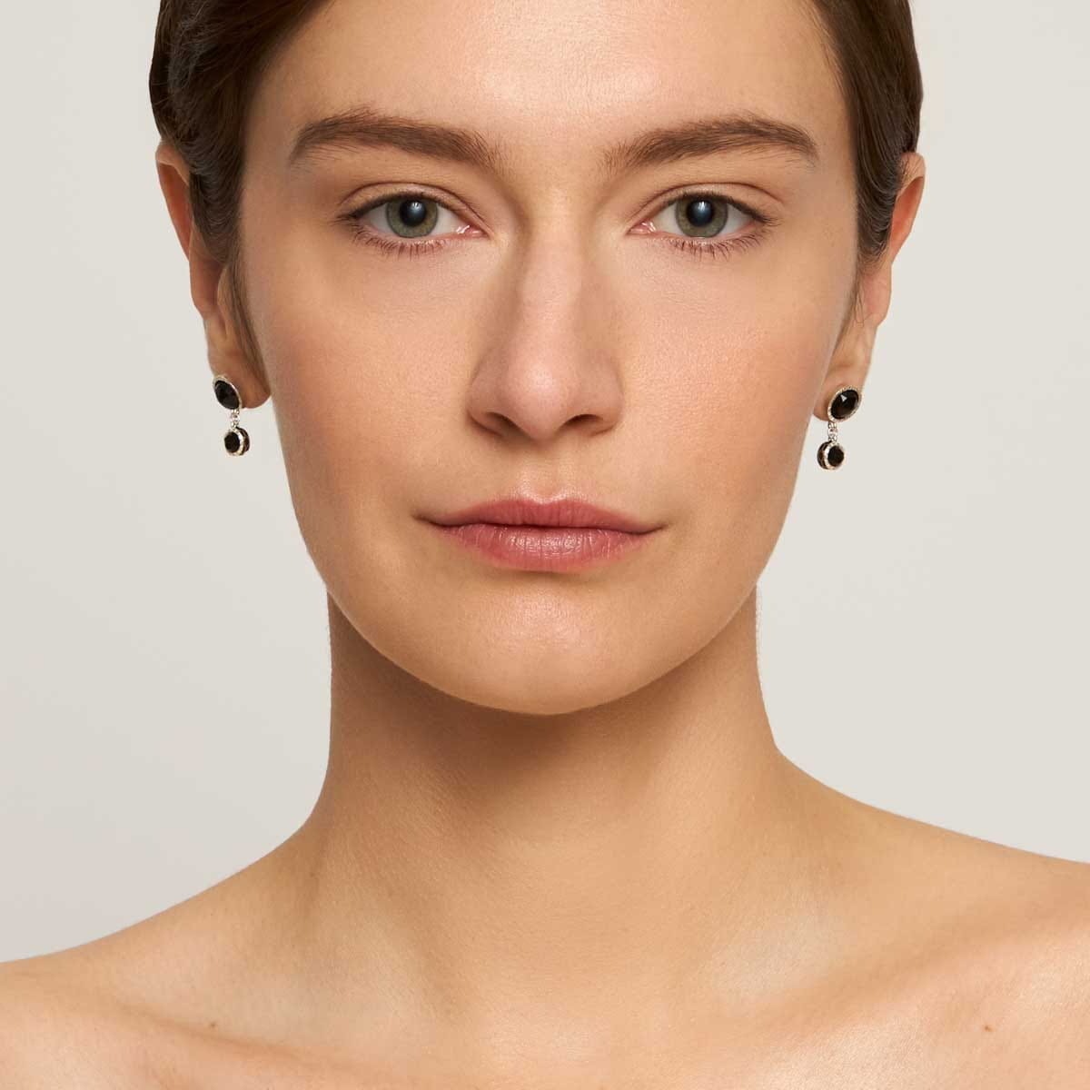 These earrings, crafted in Rajasthan from 925 silver, consist of two harmoniously combined elements. At the heart of each is a black element – the upper crystal, the lower kundan glass, traditional Indian glass. The upper element is larger, the lower smaller. Each is set in a round silver frame. Additionally, the edges of the smaller element are adorned with intricately crafted black enamel ornaments. In Indian symbolism, black represents the undiscovered. It is the color of depth, reflection, and intimacy, giving the jewelry an elegant and intriguing character.