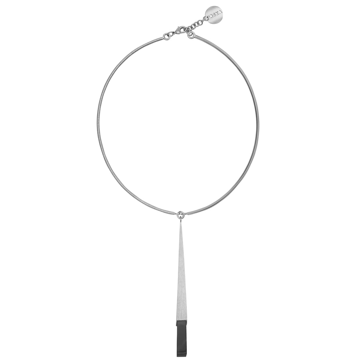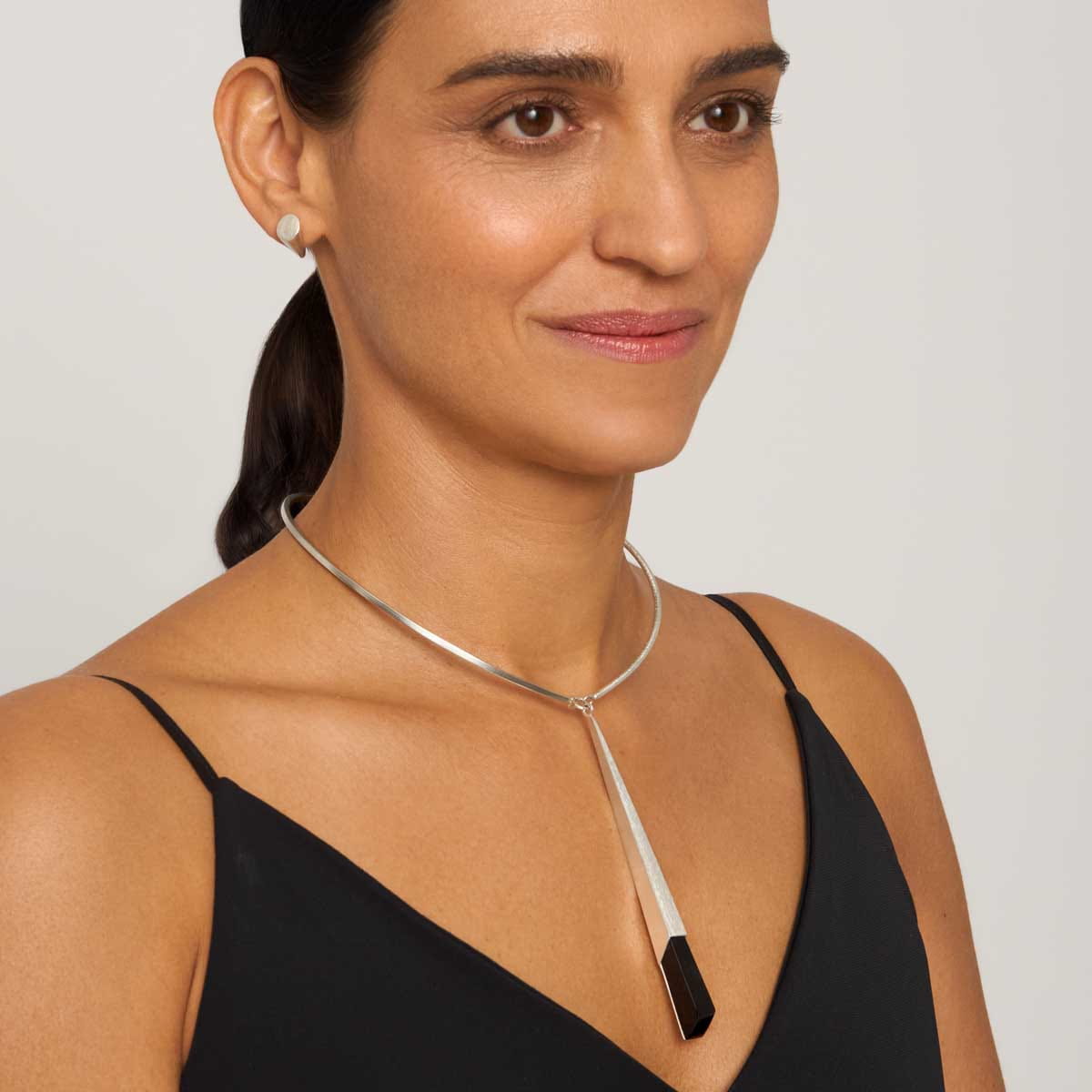 This rigid, striking collar is made of 925 sterling silver. The elements gently wrapping around the neck have a brushed finish. The necklace includes an extender chain for adjustable length, finished with the ORSKA logo. The centerpiece is a prominent pyramid-shaped pendant holding a black jadeite stone. The polished stone is framed by geometric brushed silver. The jadeite was hand-cut by Master Stanislavo in his Guatemalan workshop, transforming raw, irregular blocks into stones with exceptional color, shine, and minimalist geometric forms.