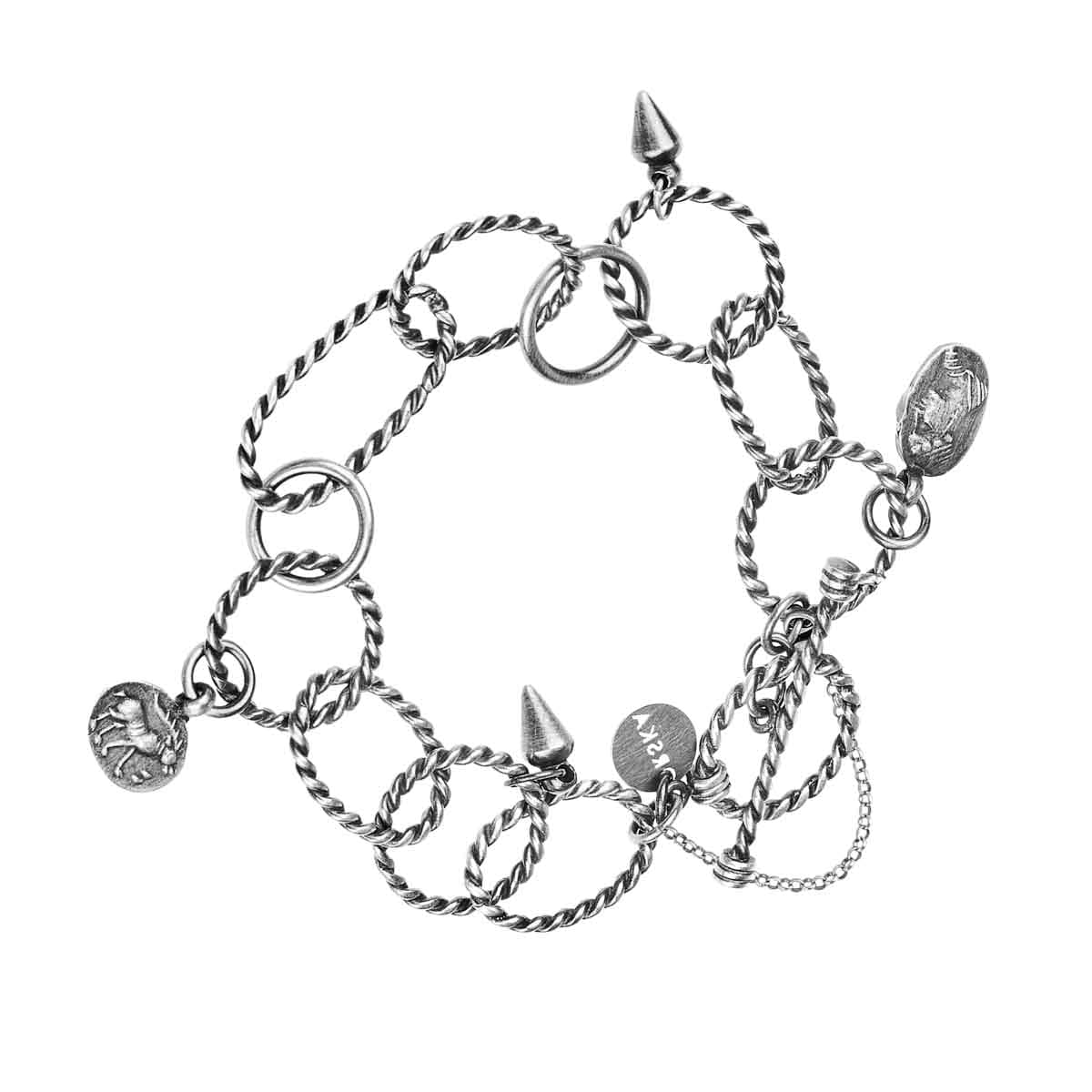 The bracelet is handmade in the ORSKA jewelry studio from 925 sterling silver. It consists of oval and round elements linked together into a decorative chain. Spiral-twisted links are paired with links featuring a smooth, satin finish. This play of textures makes the piece intriguing and eye-catching. The bracelet is adorned with two arrowhead-shaped charms and two small medallions with symbolic signs. Depending on the piece, these symbols may include mythical animals and figures, or royal figures. The bracelet fastens with a decorative clasp that not only allows for comfortable fastening but also serves as a decorative element. The composition is completed with a small ORSKA logo.