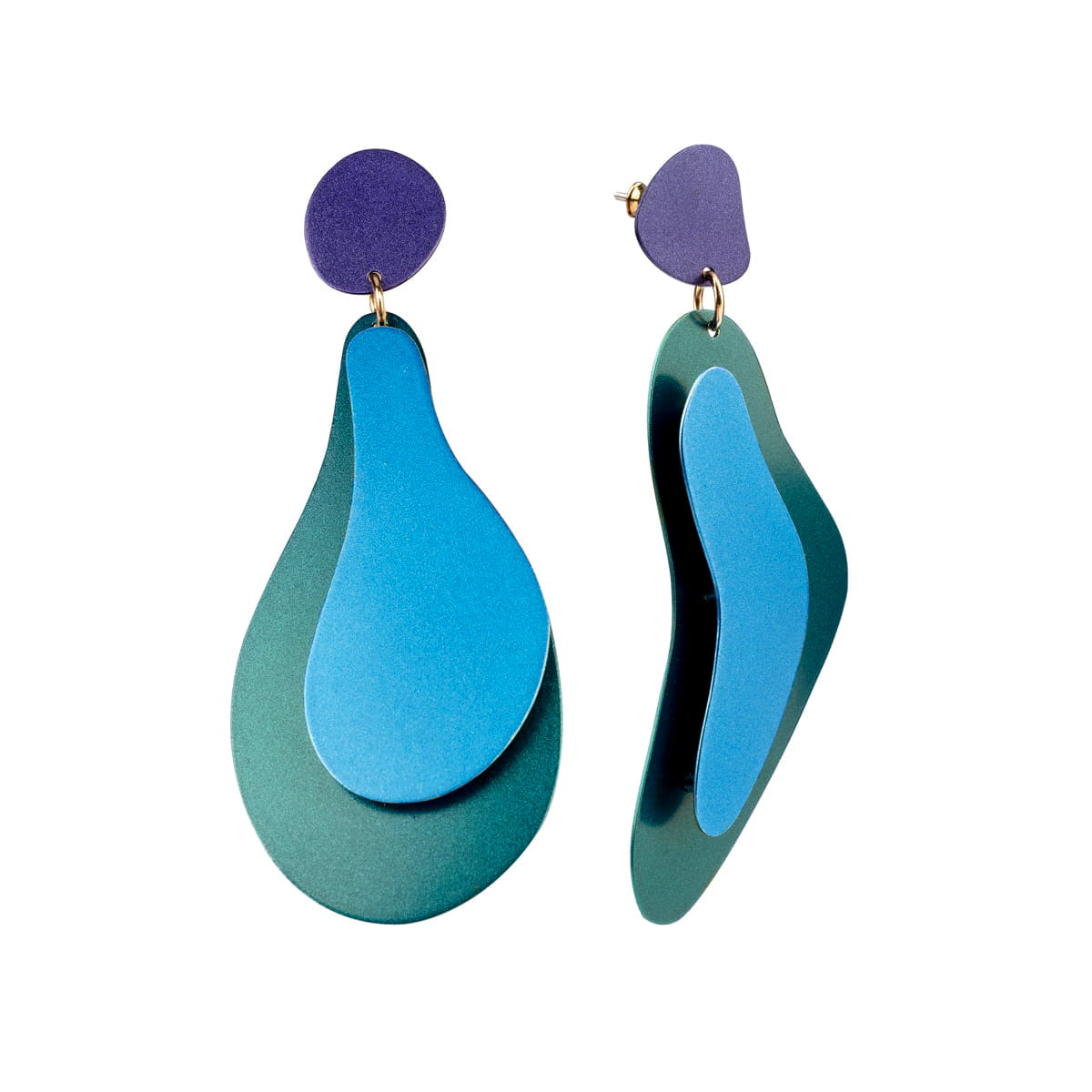 The earrings were handmade of brass, and then hand-painted in the ORSKA studio in intense colors with a pearly glow. The design resembles spots of paint flowing down the canvas of an abstract painting. The earrings consist of irregular shapes combined into a three-dimensional, movable, and light whole. The colors were chosen on purpose - purple, green, and blue created a cool yet energetic composition. They will be a perfect gift for art enthusiasts and bold women who like to play with fashion. The colorful jewelry will brighten up casual stylizations and add a hint of color to your outfit, which will have a positive effect on your well-being.