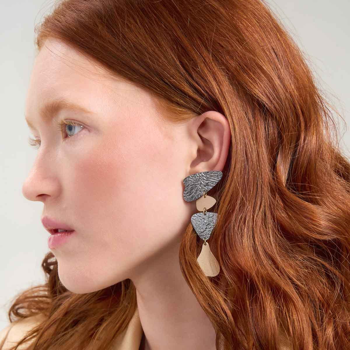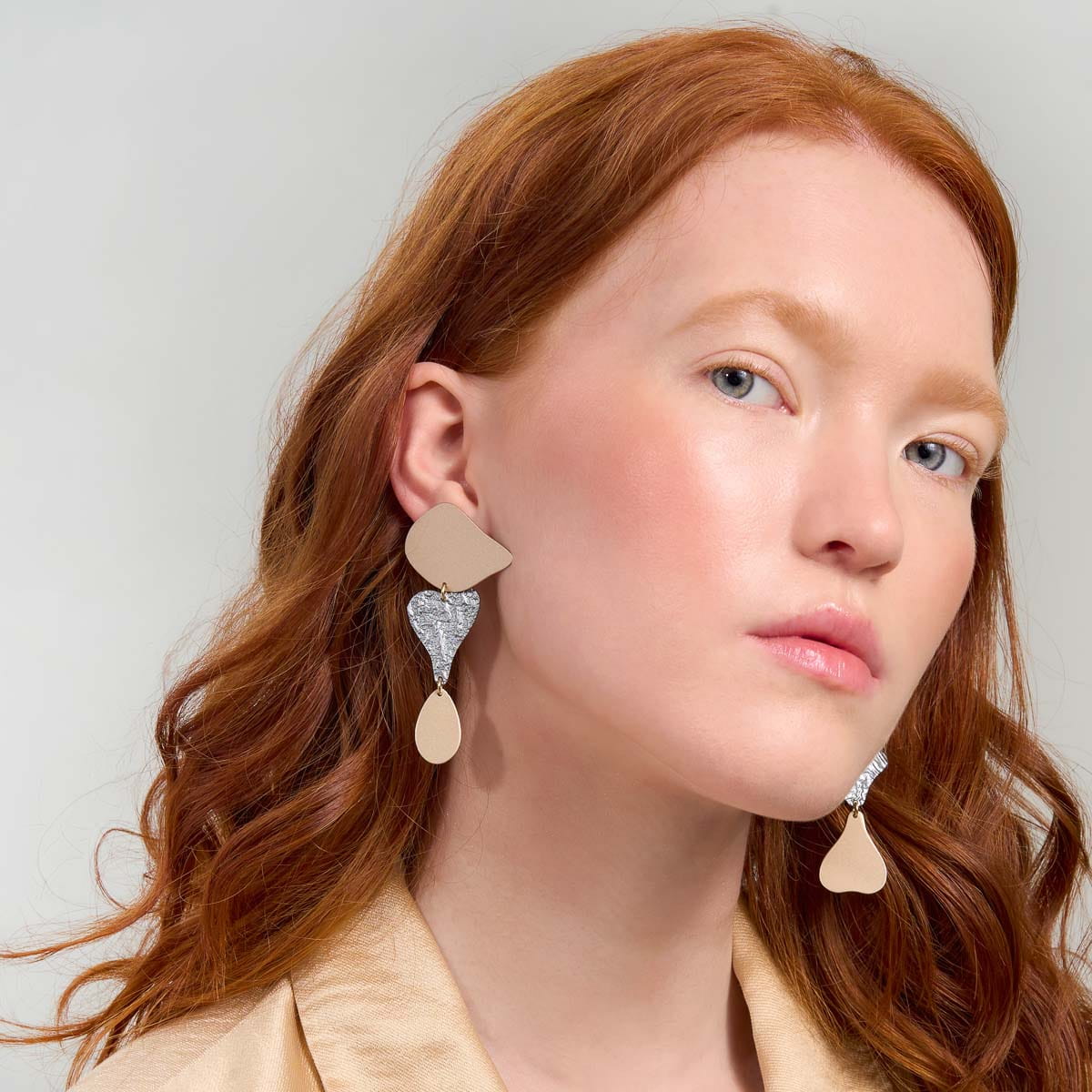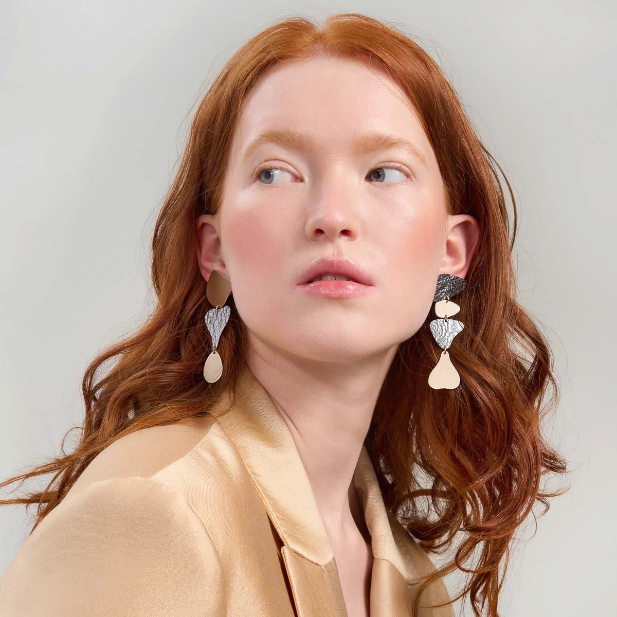 Large earrings like the company of striking bracelets and rings. Colorful earrings from the Tache collection will create an energetic set with bracelets of colorful natural stones from the Gelato collection. They will also go well with monochromatic gold designs. The structured surface of the earrings will match the designs from the Moon collection - pair them with a wide bracelet or a large ring. Maximalist statement pieces will attract attention and win compliments! Gold and gray earrings from the Tache collection, thanks to the contrasting color composition, can be worn with both gold and silver jewelry.
