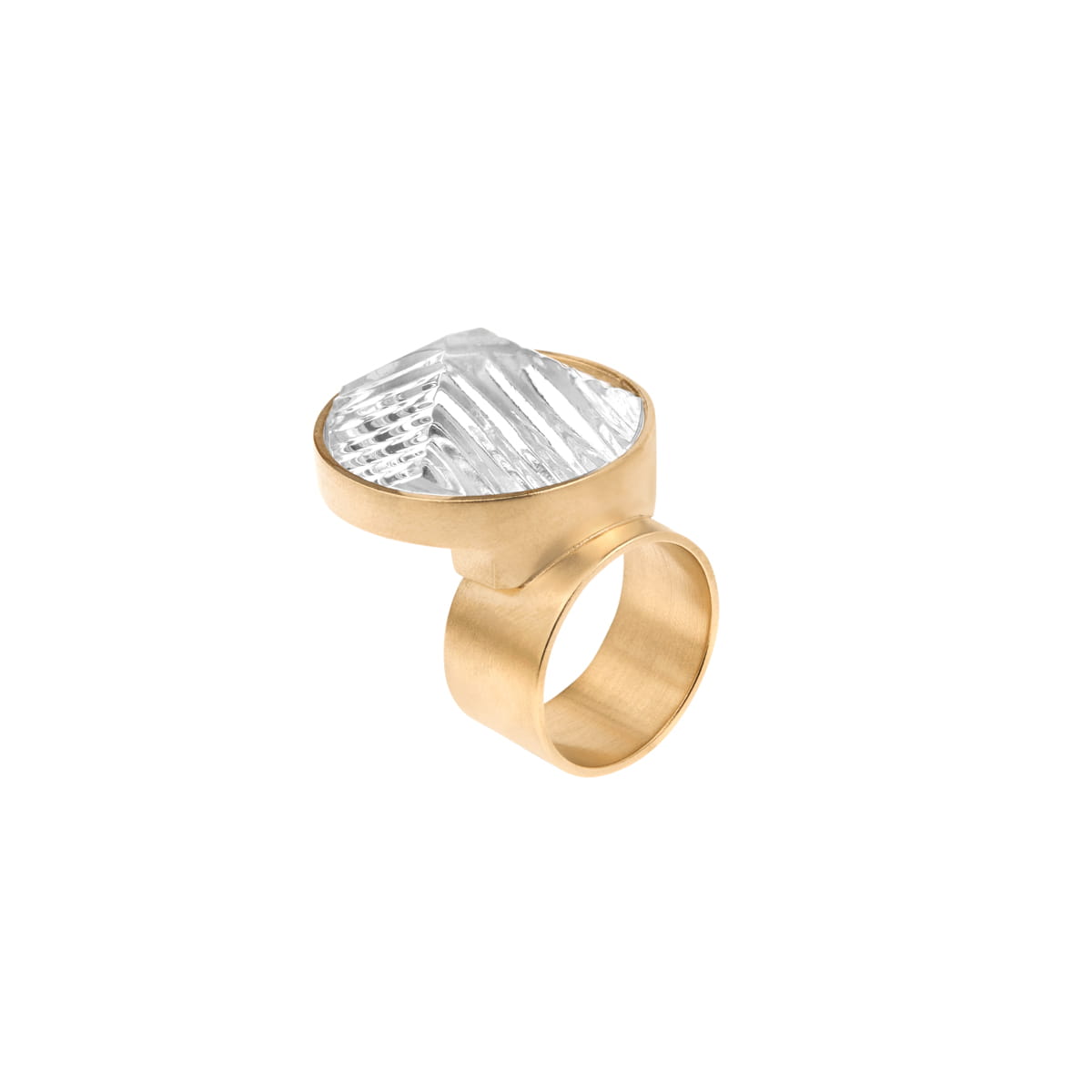 The main decorative element of the ring is crystal glass from the Huta Julia. The crystal was set in the ORSKA workshop in a gold-plated brass setting. The wide ring was decorated with a round faceted dome-shaped element made of crystal glass, which is characterized by high durability. Vertical cuts on the sides of the element gave it an original look, thanks to which it reflects the light perfectly and shimmers beautifully, without losing its transparency. The crystal resembles a shiny piece of ice.