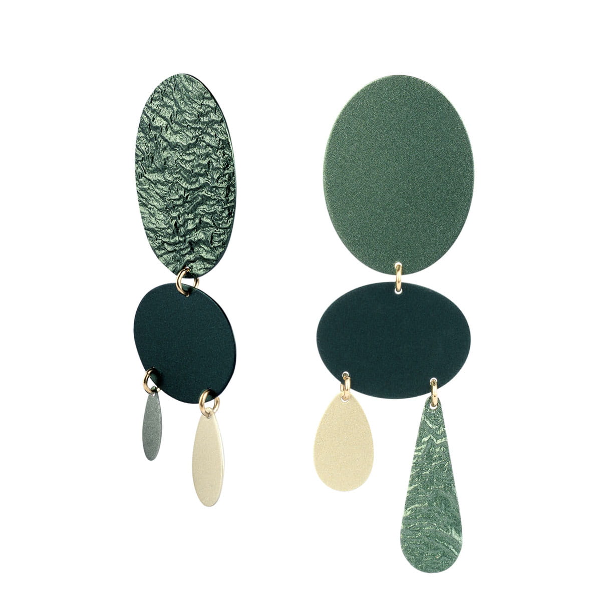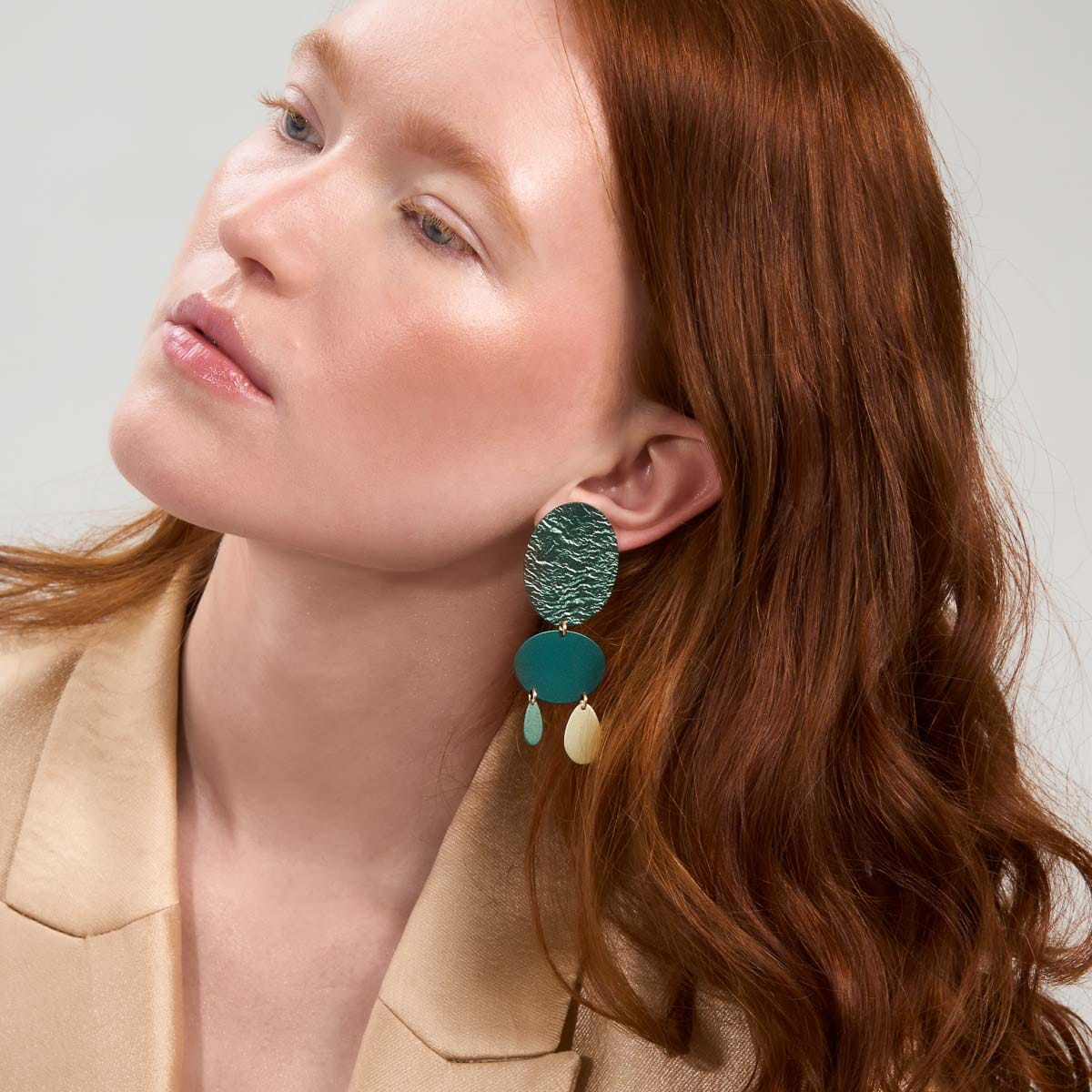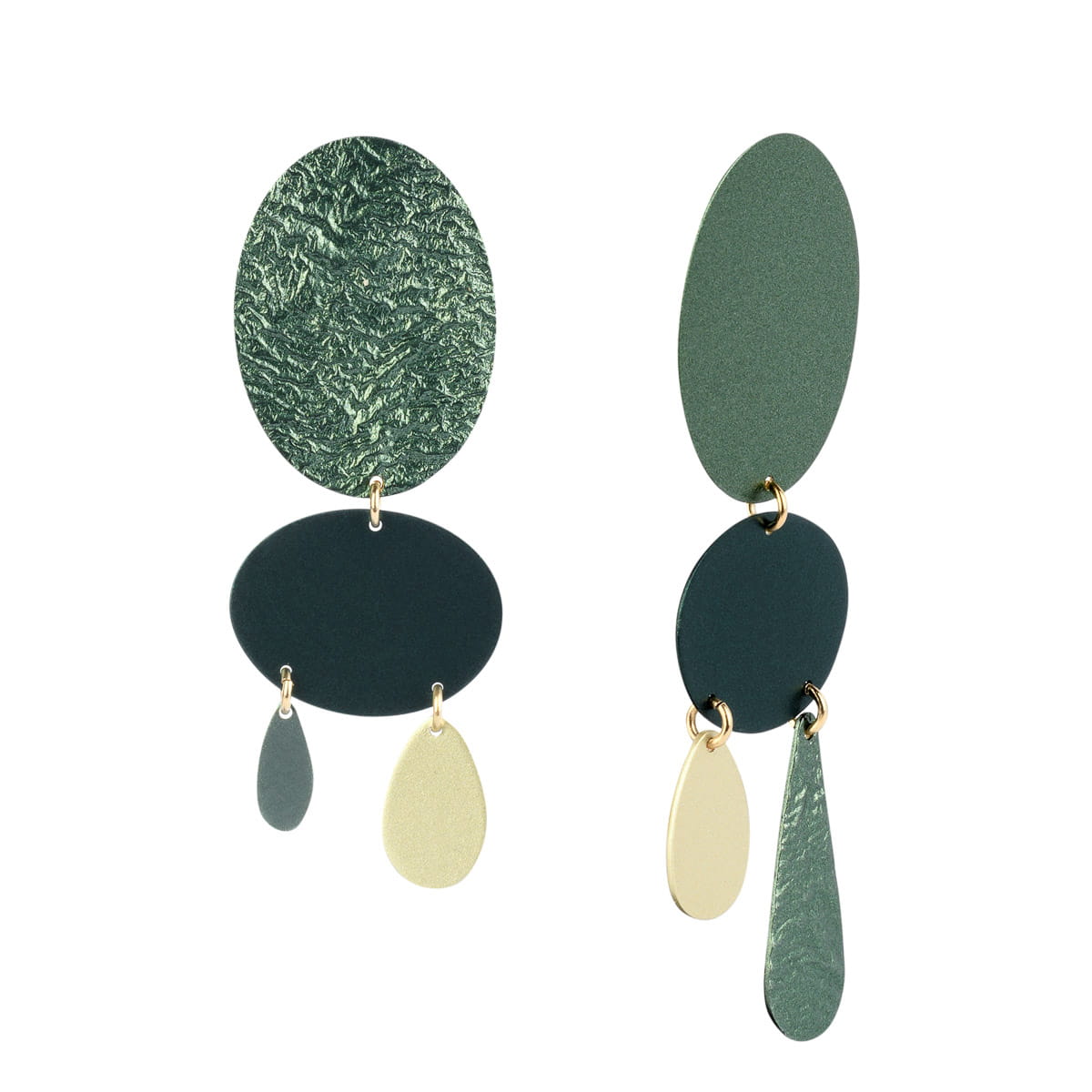 The earrings were handmade from painted brass. The asymmetrical set was created in our studio. Oval shapes of different sizes were cut from thin sheet metal and connected with gold links. As a result, the long, dangling geometric earrings move softly, and the whole looks light and elegant. Three shades of green created an energetic composition, which is complemented by the contrast of smooth and wavy structure. The green Tache earrings will attract attention and add a pop of color to the whole outfit.