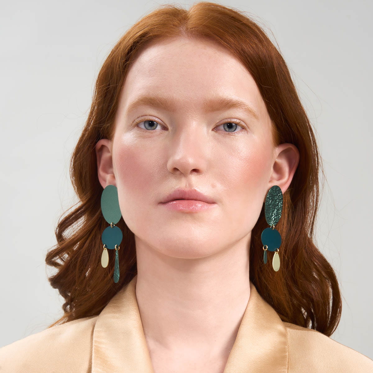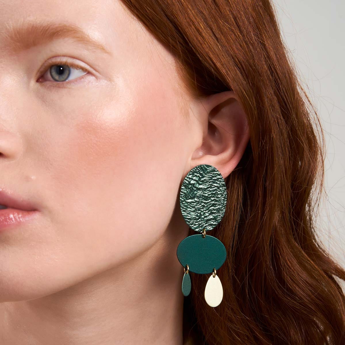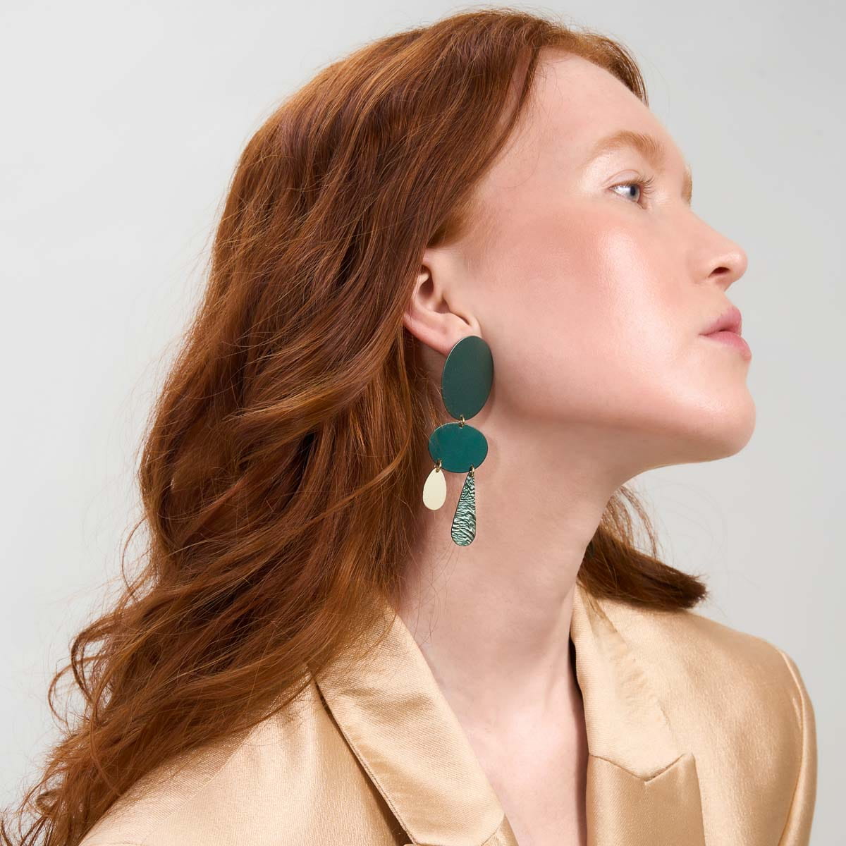 The earrings were handmade from painted brass. The asymmetrical set was created in our studio. Oval shapes of different sizes were cut from thin sheet metal and connected with gold links. As a result, the long, dangling geometric earrings move softly, and the whole looks light and elegant. Three shades of green created an energetic composition, which is complemented by the contrast of smooth and wavy structure. The green Tache earrings will attract attention and add a pop of color to the whole outfit.