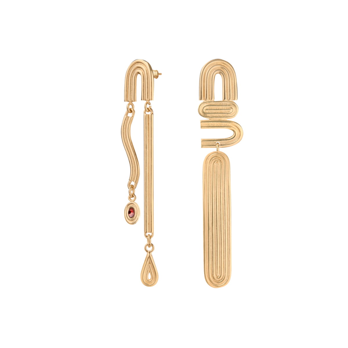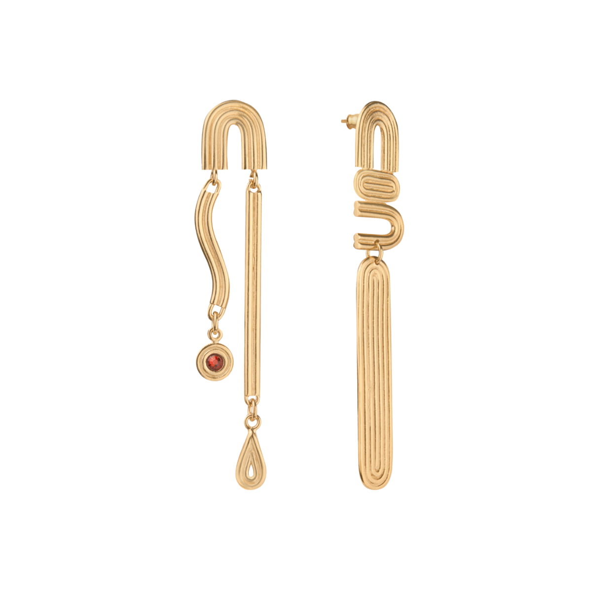 The earrings, inspired by the four elements, were handmade at the ORSKA atelier. The two asymmetrical hanging earrings were composed of oval and round elements and arches. They were cast in brass and then plated in gold. The elements, connected by fine links, give the impression of lightness. The allegory of air is shaped like a constantly flowing arc of air. The fire symbol is shaped like a candle flame. It carries warmth and energy emphasized by the crystal in fiery red. The minimalist earth symbol alludes to a bird's eye view of fields. The water symbol was inspired by the gentle tide of the sea. The fanciful shapes of the symbols of the four elements are decorated with soft lines built of interconnected brass rods, which give the earrings elegance. The timeless form and universal character allows you to combine the earrings with both a winter sweater and a summer dress.
