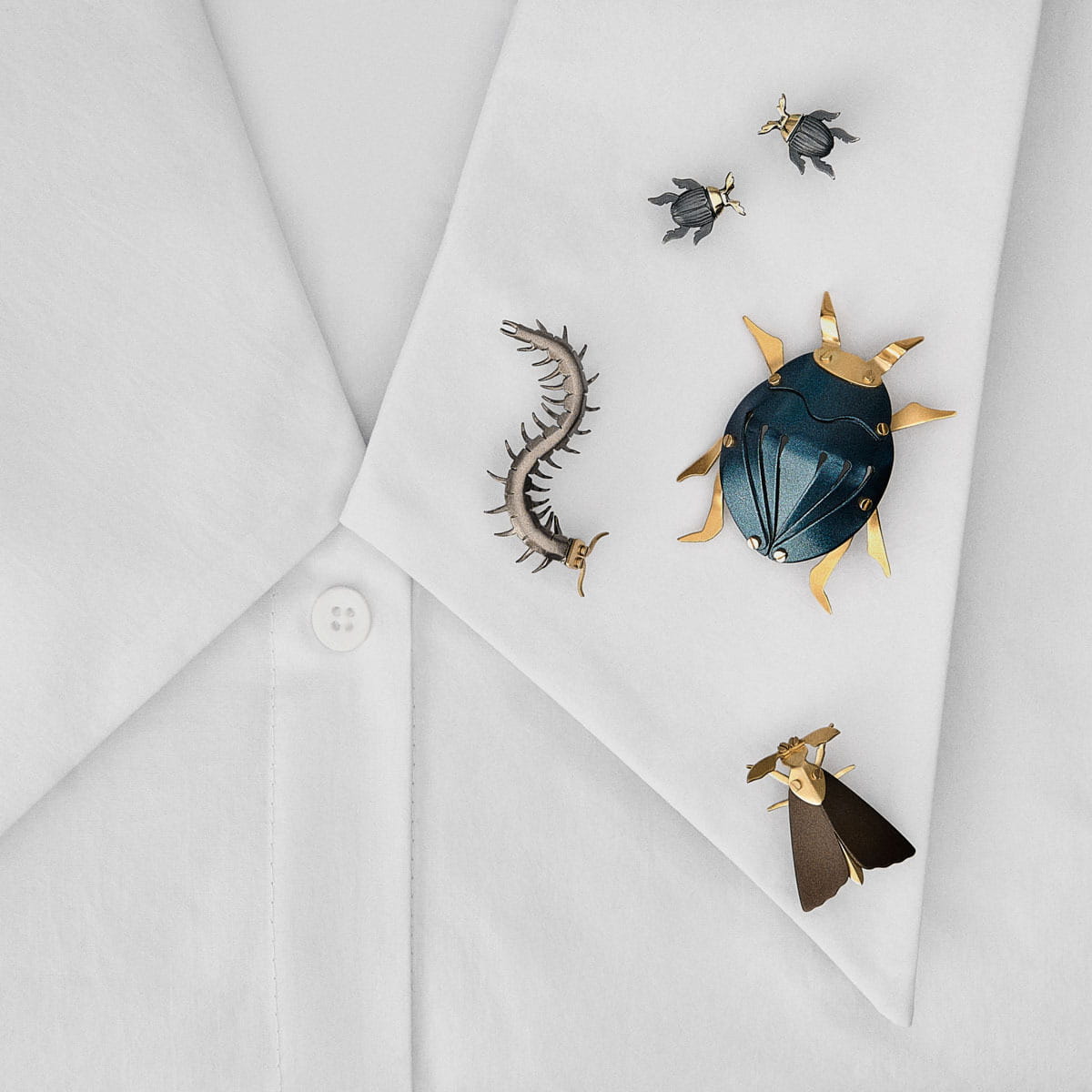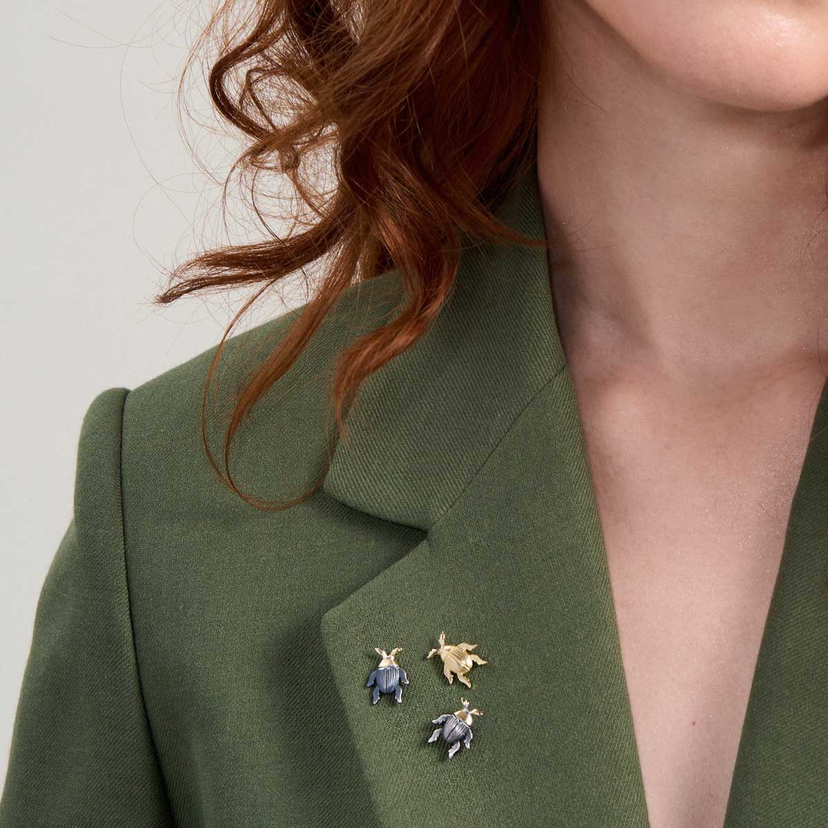 The artistic, handcrafted pin from the INSECTS collection was inspired by the richness of the insect microcosm. The jewellery made according to designs of Anna Orska is a creative way to turn negative feelings, which most of us have towards insects, into fascination and desire. Beetle was handmade of brass and are available in two colour versions: golden-graphite grey or golden. Intriguing design of pin makes it an effective eye-catcher, despite their small size. The original form will be an excellent choice for the contrary enthusiasts of the design with character.