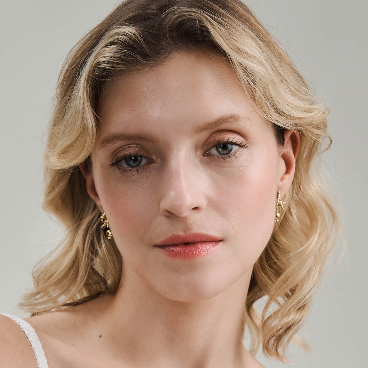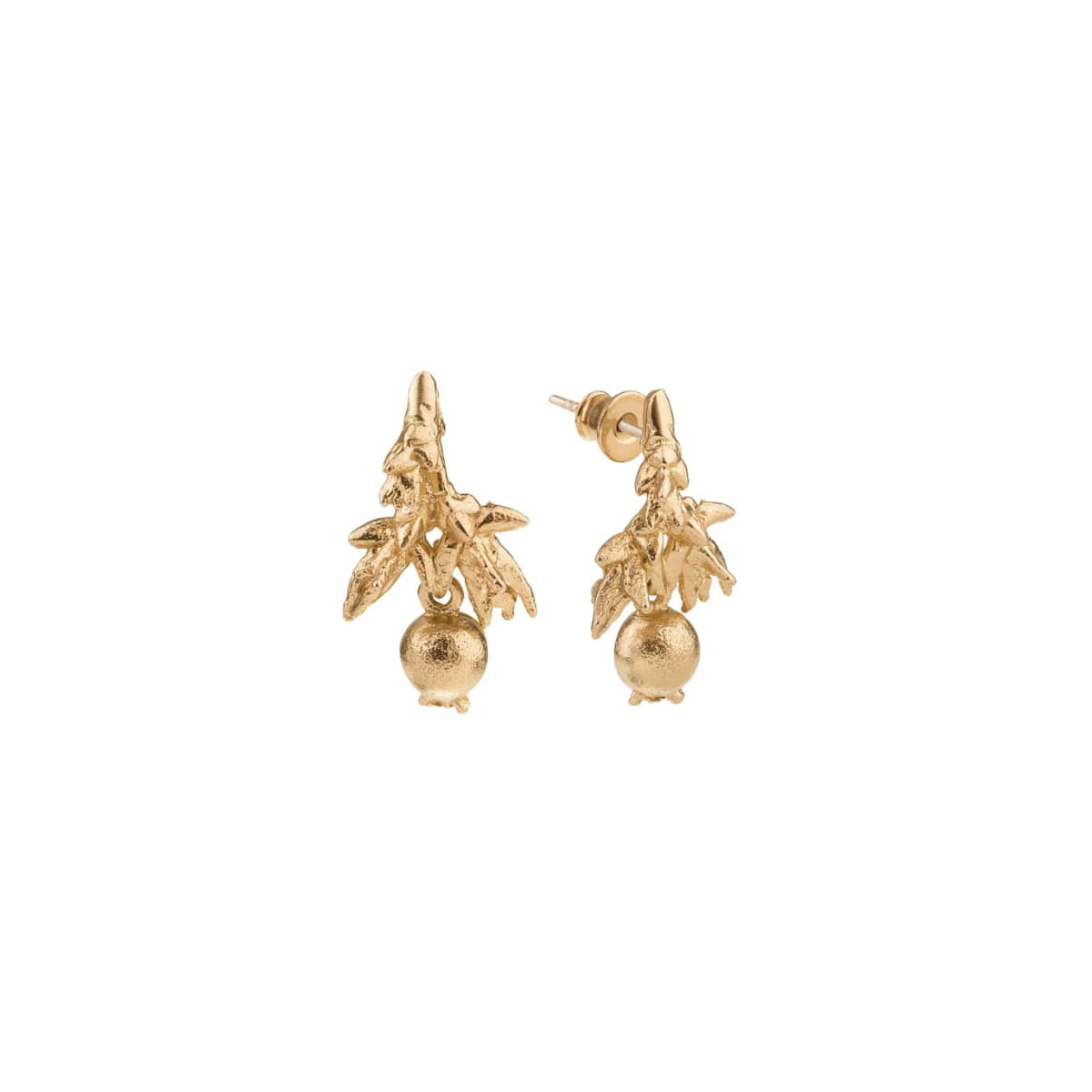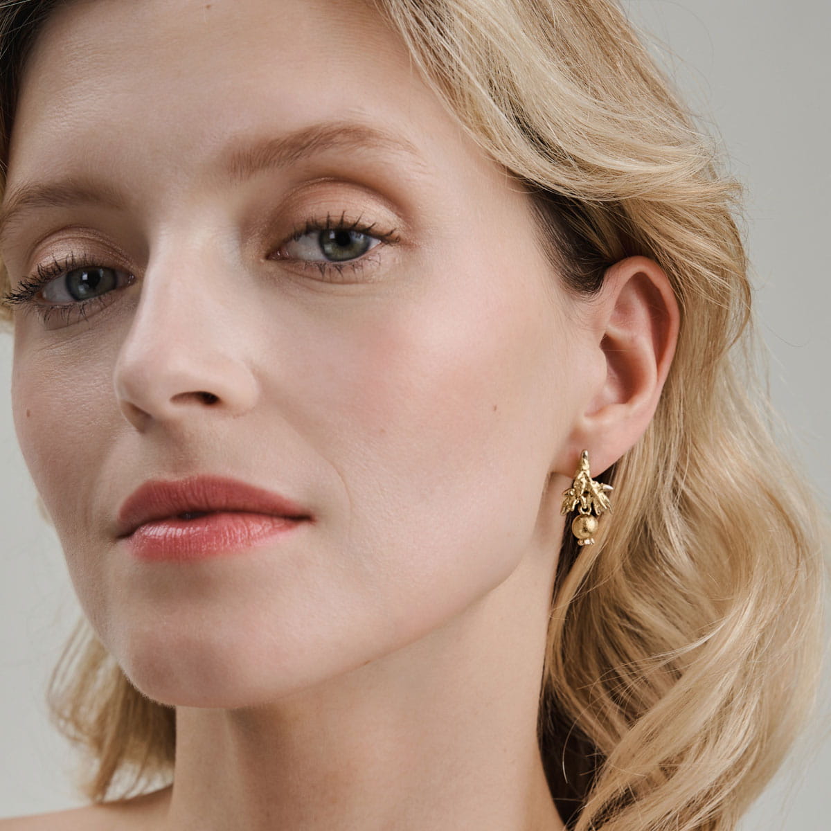 The earrings were handmade in our Poznań workshop. The plant shapes were cast in brass, while the stud and clasp were made of silver. The golden leaves were decorated with a hanging berry fruit. The whole was connected by a fine link, so that the earrings are light and delicate, and their form resembles freshly picked berries. The small artistic earrings will complement everyday outfits, adding them a touch of glamor. They make an excellent gift idea for women who appreciate original jewelry. The minimalist earrings look best combined with the impressive necklace with rubies - together they will create a set that will attract attention.