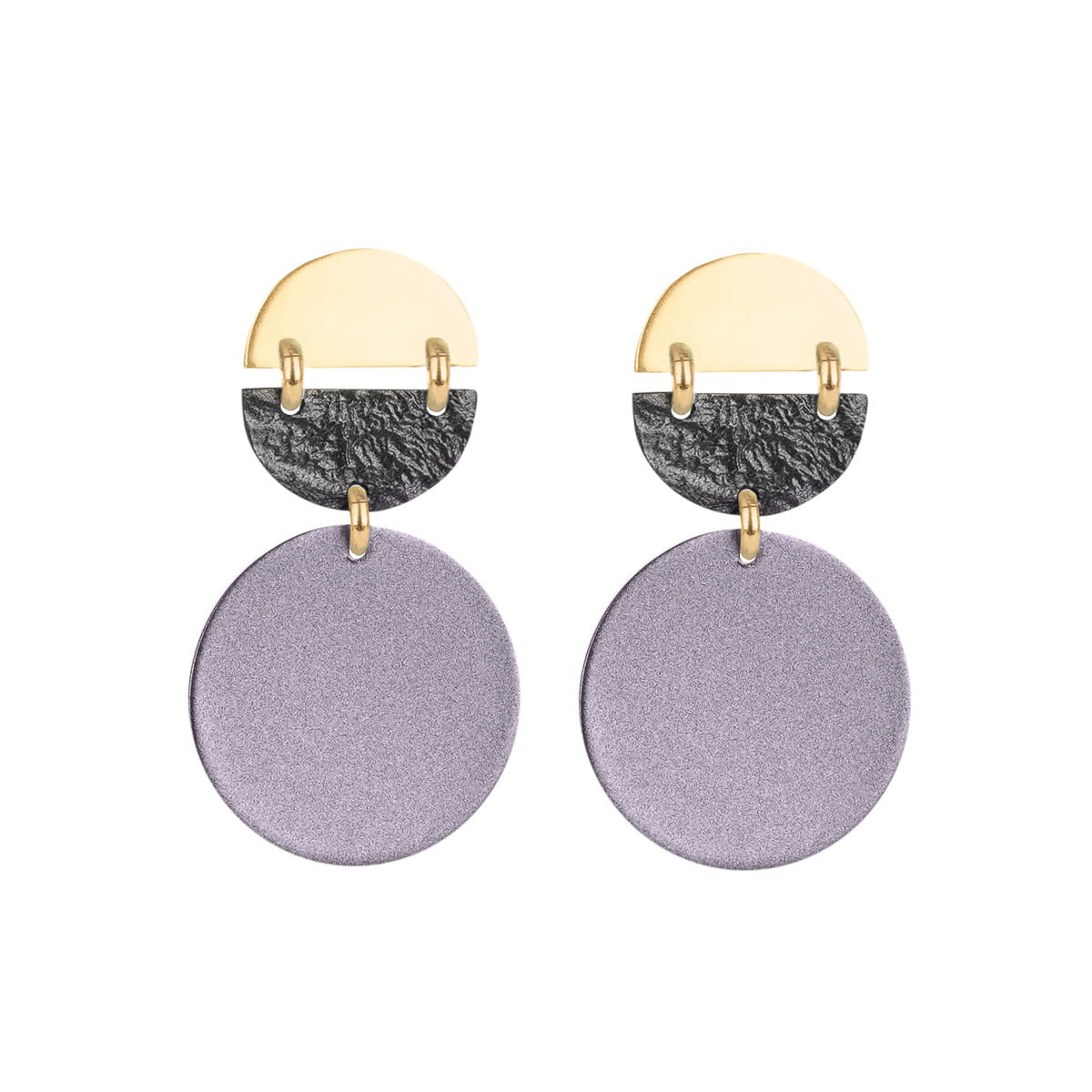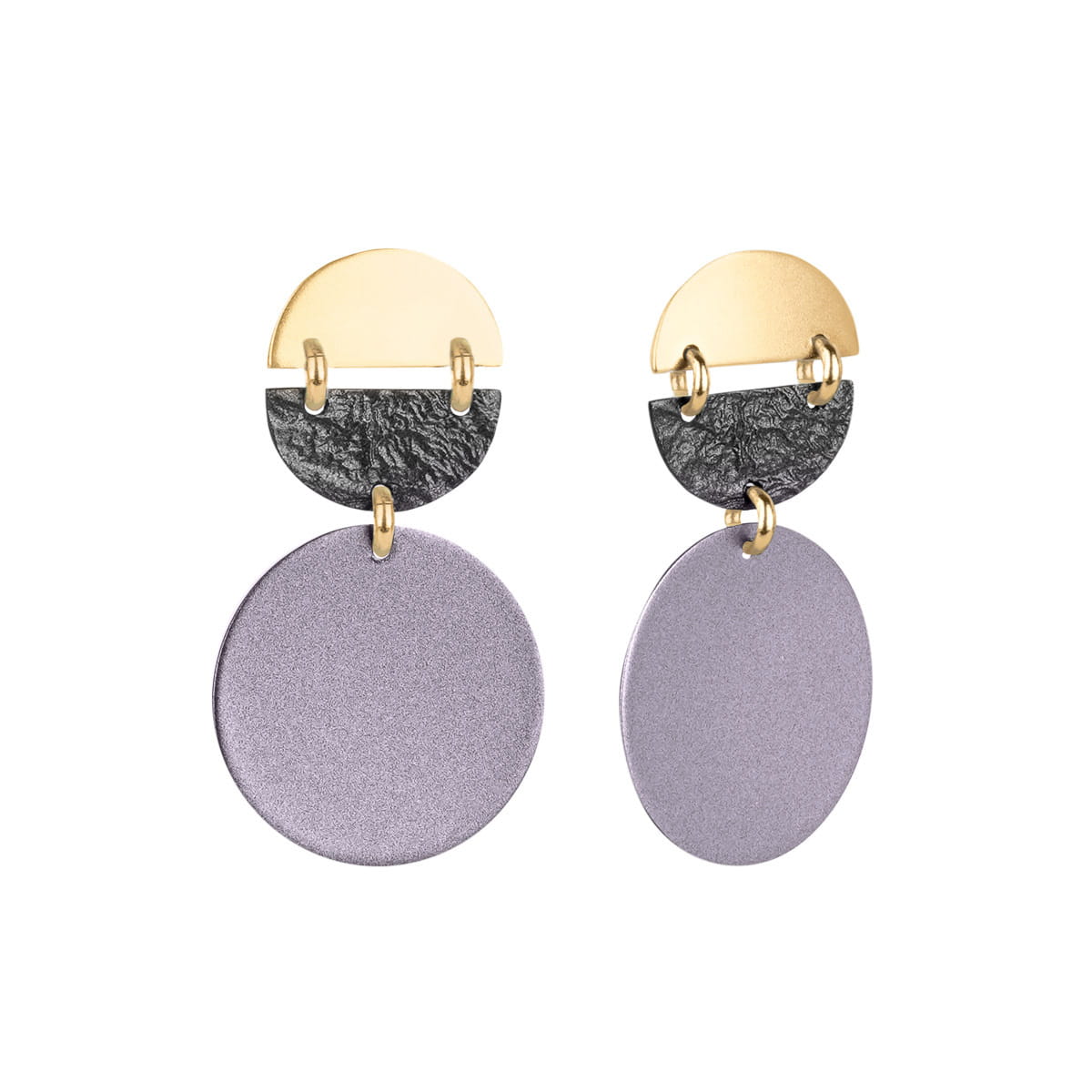 The brass earrings were handmade and hand-painted at the ORSKA studio. Pastel purple circles with a pearl finish were contrasted with two smaller semicircles: a smooth one in gold and a structured one in graphite. The jewelers used gold links to connect these elements. As a result, the hanging earrings move softly, and the whole looks light and playful. The original design will perfectly emphasize the creative character of the owner. Hanging earrings inspired by paintings will also work well as a gift for passionate art enthusiasts.