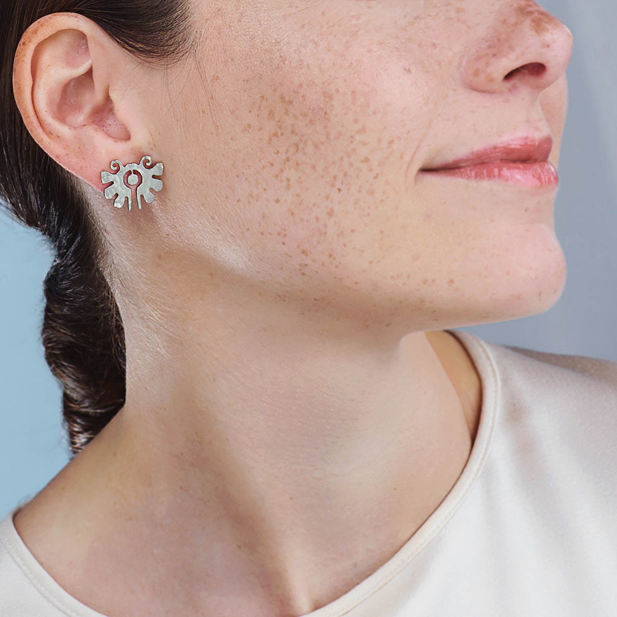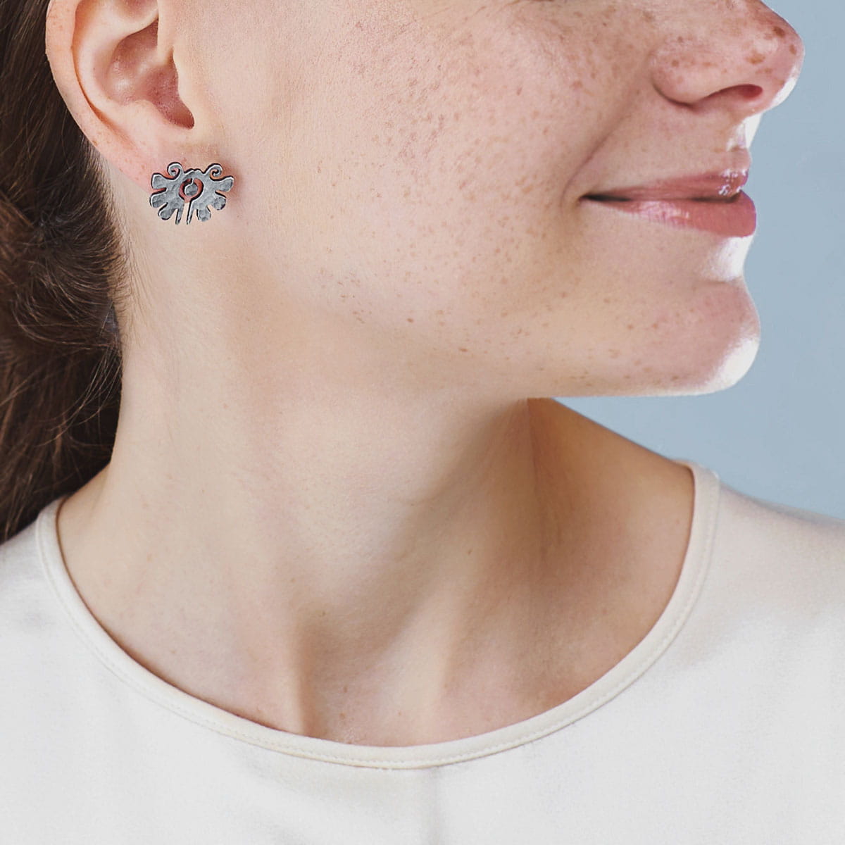 The endless knot of happiness is at your fingertips in the jewellery from the ETERNAL collection. Anna Orska was inspired by riddles, amulets and intricate labyrinths that have been attracting those curious of the world for centuries. The artistic, subtle earrings are handcrafted of brass (or nickel silver) with a hammered surface. The delicate pattern will decorate both an evening dress as well as everyday styling. A beautiful object for inspiring people.