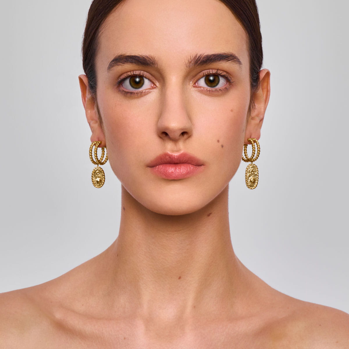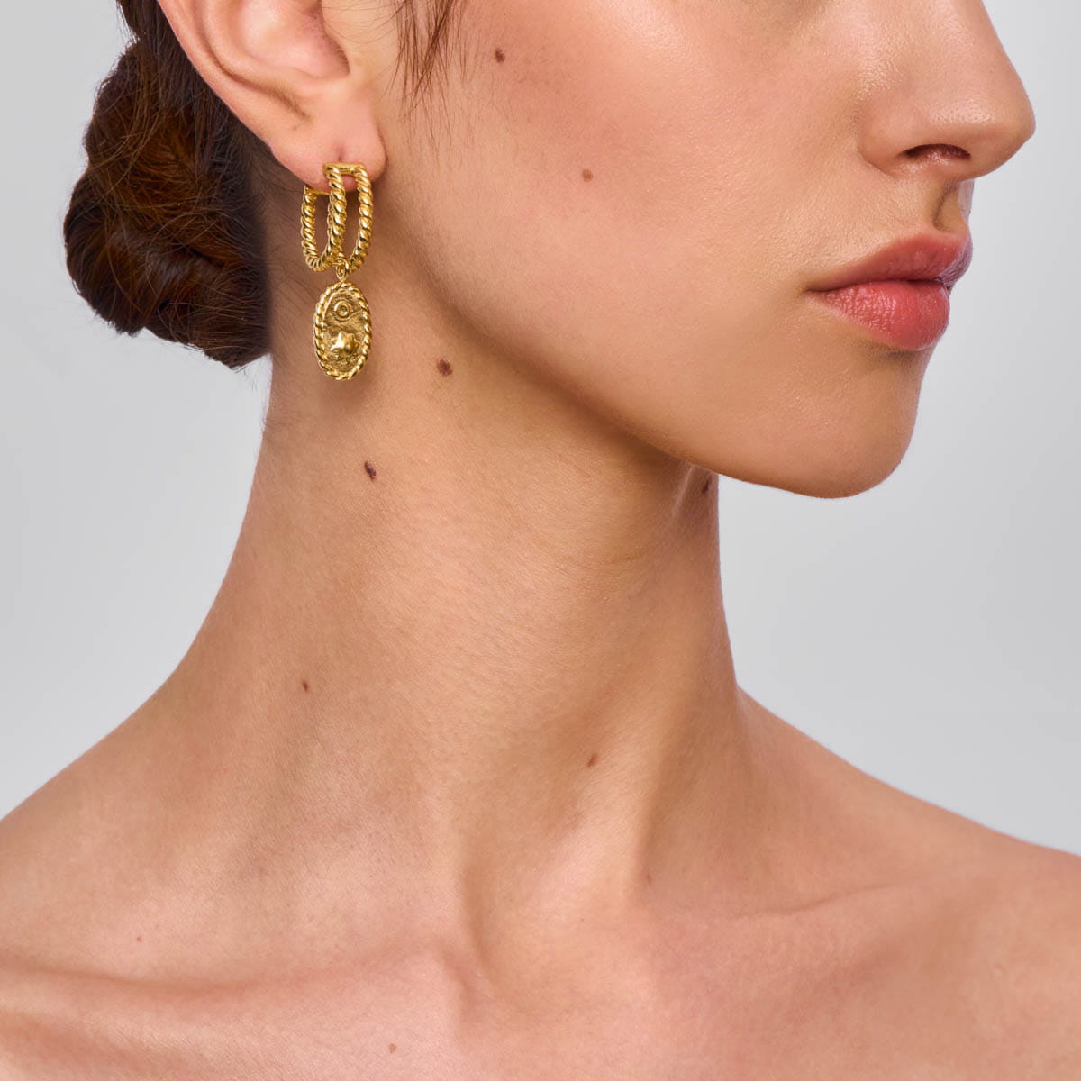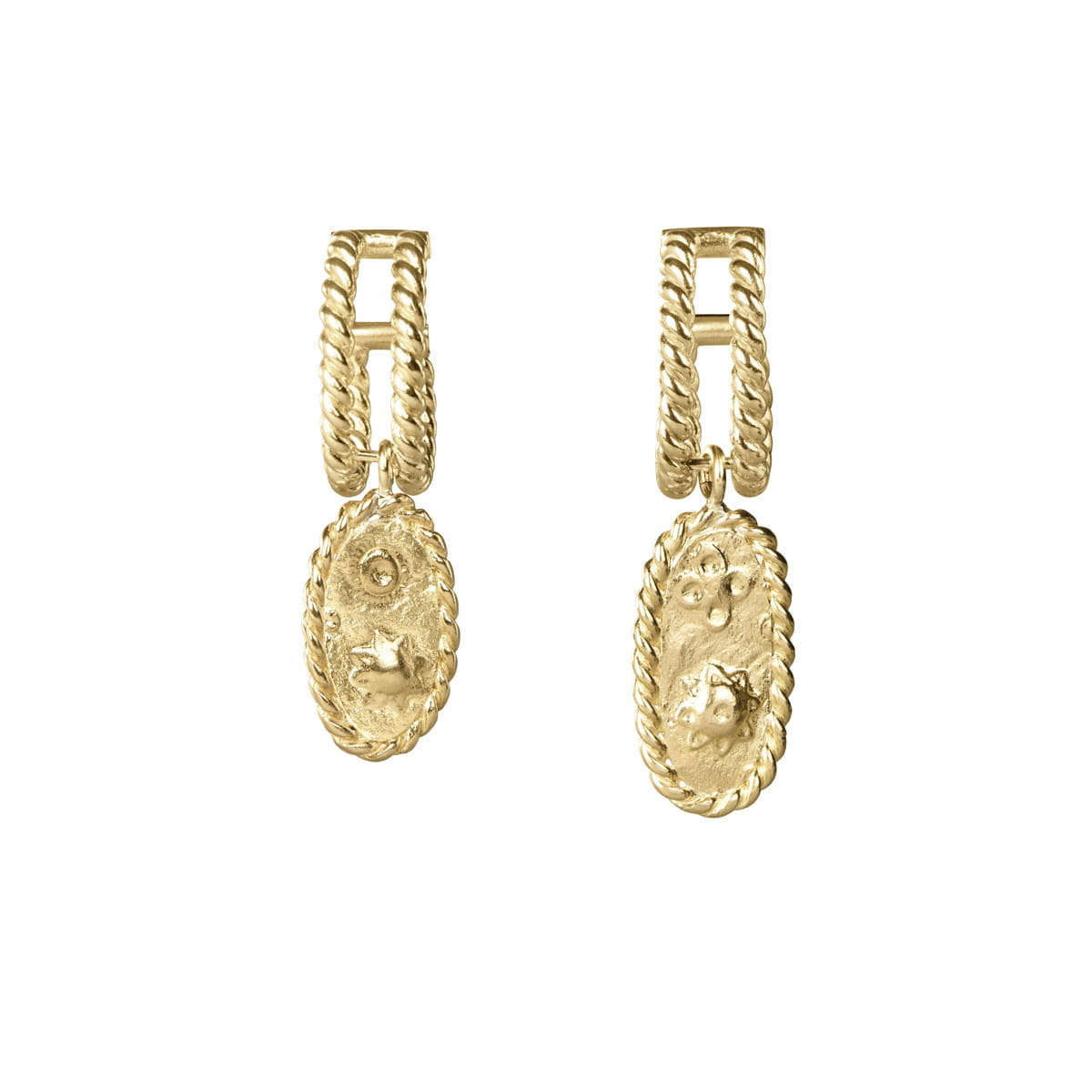 These earrings are handcrafted from gold-plated brass. We doubled the classic hoop shape, giving it a unique braided texture, and adorned it with elongated pendants—fragments of decorative medallions. Each charm is embellished with ornate patterns. The earrings are asymmetrical (one features a larger pendant), giving the jewelry a striking and eye-catching character. Paired with a matching bracelet and a wide ring featuring the same ornamental motif, these earrings will complete classic, monochrome outfits with a unique and original finish.