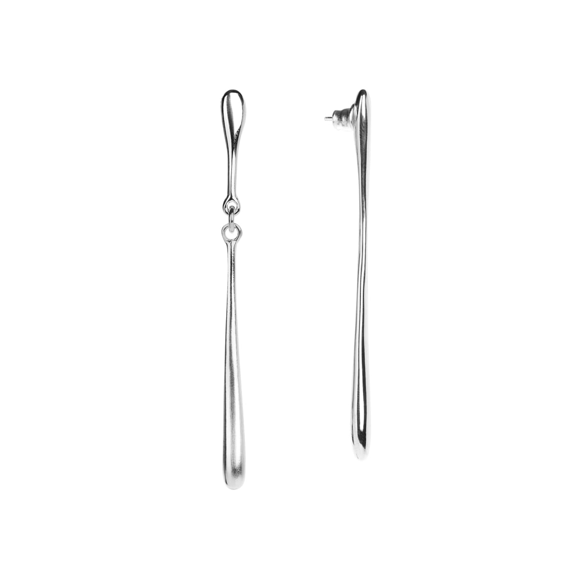The asymmetrical pair of earrings looks as if it was made of elongated drops of liquid metal. The first, longer earring was created from two teardrop-shaped elements joined together. The second is shorter and consists of a single, long element. The earrings were created from bright silver with a high luster, which suits any type of beauty, and in the form of long earrings illuminates the face. Silver earrings are versatile and timeless, but they also like creative combinations. Pair them with a gold necklace or bracelet and believe in the power of contrasts!