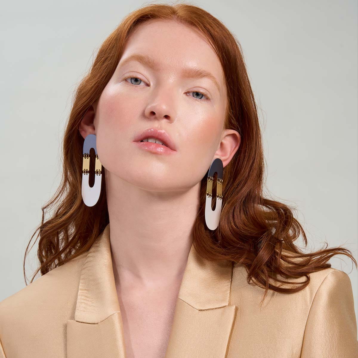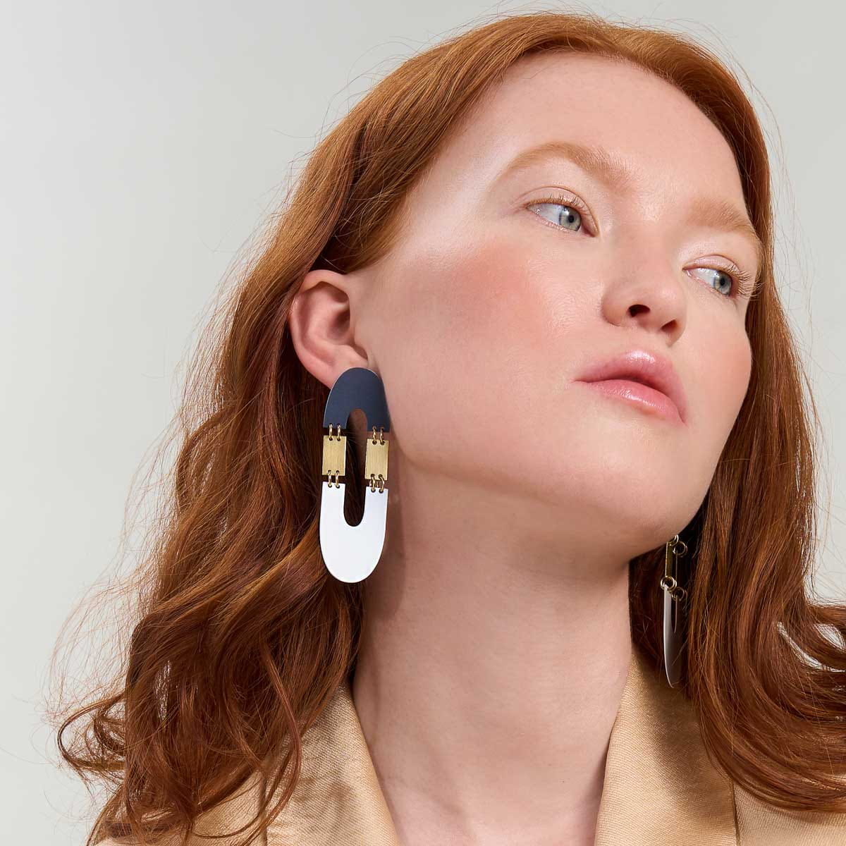 The form of the earrings is inspired by modern art. The design in the style of abstract art combines the right proportions, geometric form, and vivid colors. The colorful earrings from the Tache jewelry collection refer to geometric abstractionism. According to it, geometry can be a way to organize the world. The unique design and a combination of bright colors will emphasize the creative nature of the owner. The original earrings will be a great gift for spontaneous women with an artistic soul. The classic combination of graphite, gold, and white will be perfect for those who want to try out colorful jewelry in a subtle version.