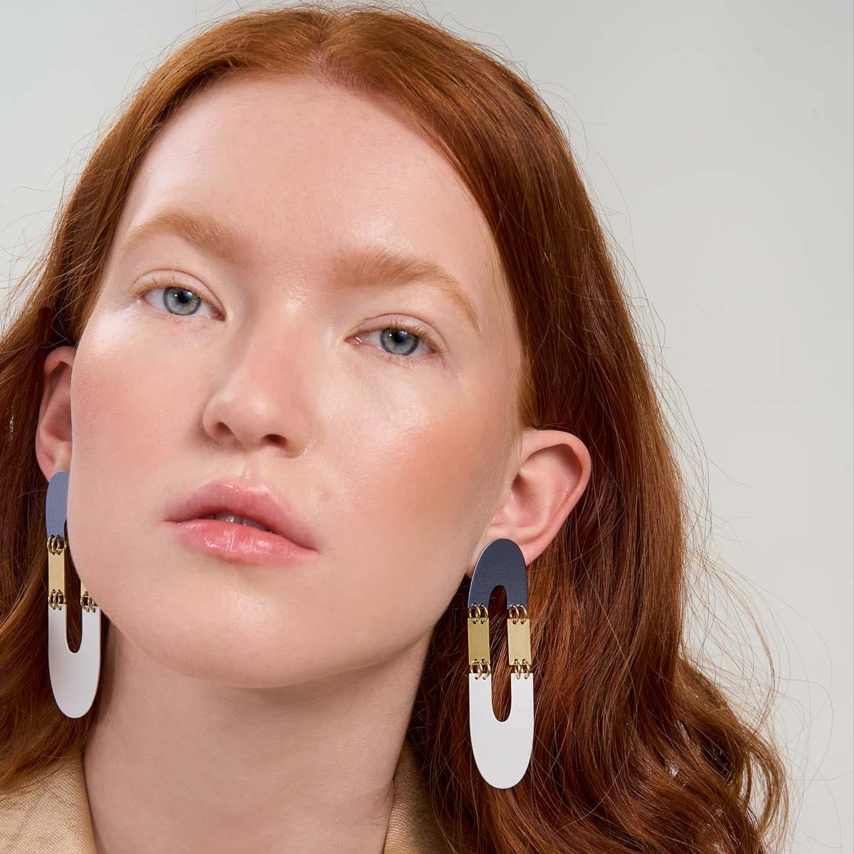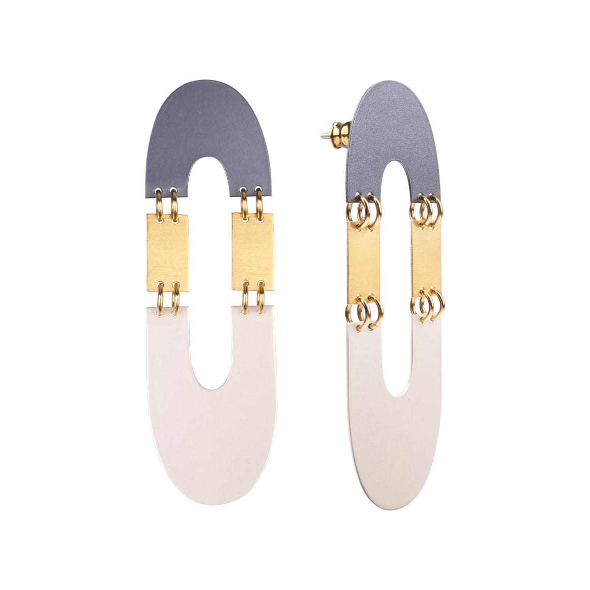 The earrings were handmade and hand-painted in our studio. They have an elliptical shape divided into three segments: silver-graphite, golden, and white. The three elements are connected by small golden links. This gives the whole design a light and playful look. The color combination is elegant and timeless.