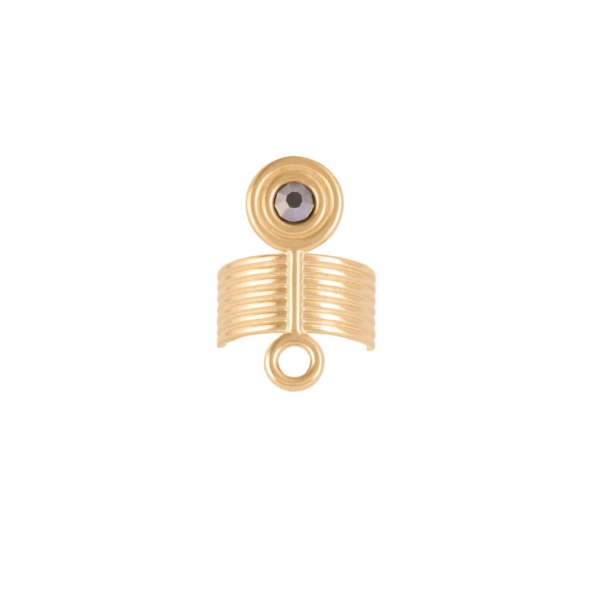 The ring from the Holos collection was cast in brass and then gold-plated. It has the form of a wide, open band. The jewelry piece is composed of gold-plated rods intersected vertically by a perpendicular ornament finished with circles on both ends. The form, inspired by the aerial view of fields and complemented with a crystal in a hematite-grey shade, is our original symbol of the Earth element. This element, the one closest to humans, is associated with a protective energy that provides support, a sense of security, nourishment, and shelter.