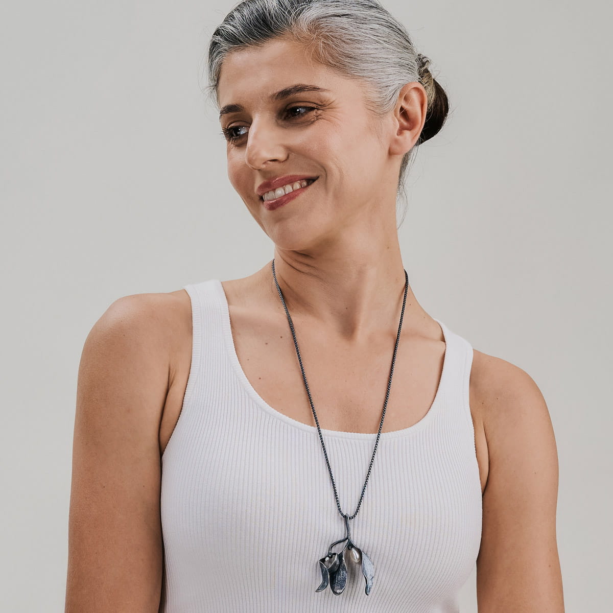This handcrafted necklace is inspired by mistletoe. The plant has been considered a gift from the gods and a panacea for all ailments since ancient times. The vitality of mistletoe is so strong that even on a leafless tree it remains evergreen. It is therefore worth to benefit from its magical powers, because when worn around the neck, it brings prosperity, protects against evil and, most importantly, strengthens the relationship between souls and bodies. The plant has been reproduced in its actual shape and size. The pendant has been refined with cultured pearls.