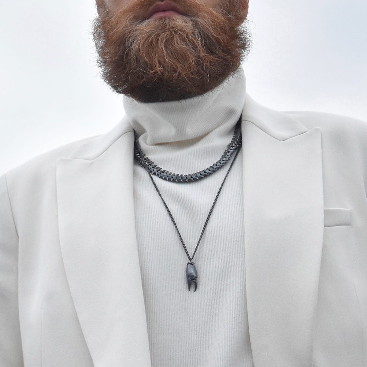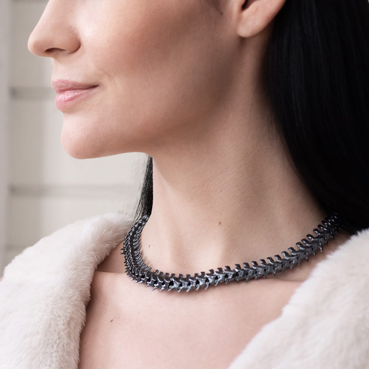 Fossils! Sharp and expressive shark fangs have been collected from ocean beaches, where they spent thousands of years. Together with pincers and snake vertebrae, they inspired Anna Orska to create the Fossil collection, which guarantees a crushing selection of sharp jewelry. The short, artistic necklace was handcrafted from snake vertebrae cast in brass. The original design attracts attention and adds character to everyday styling, both for women and men.