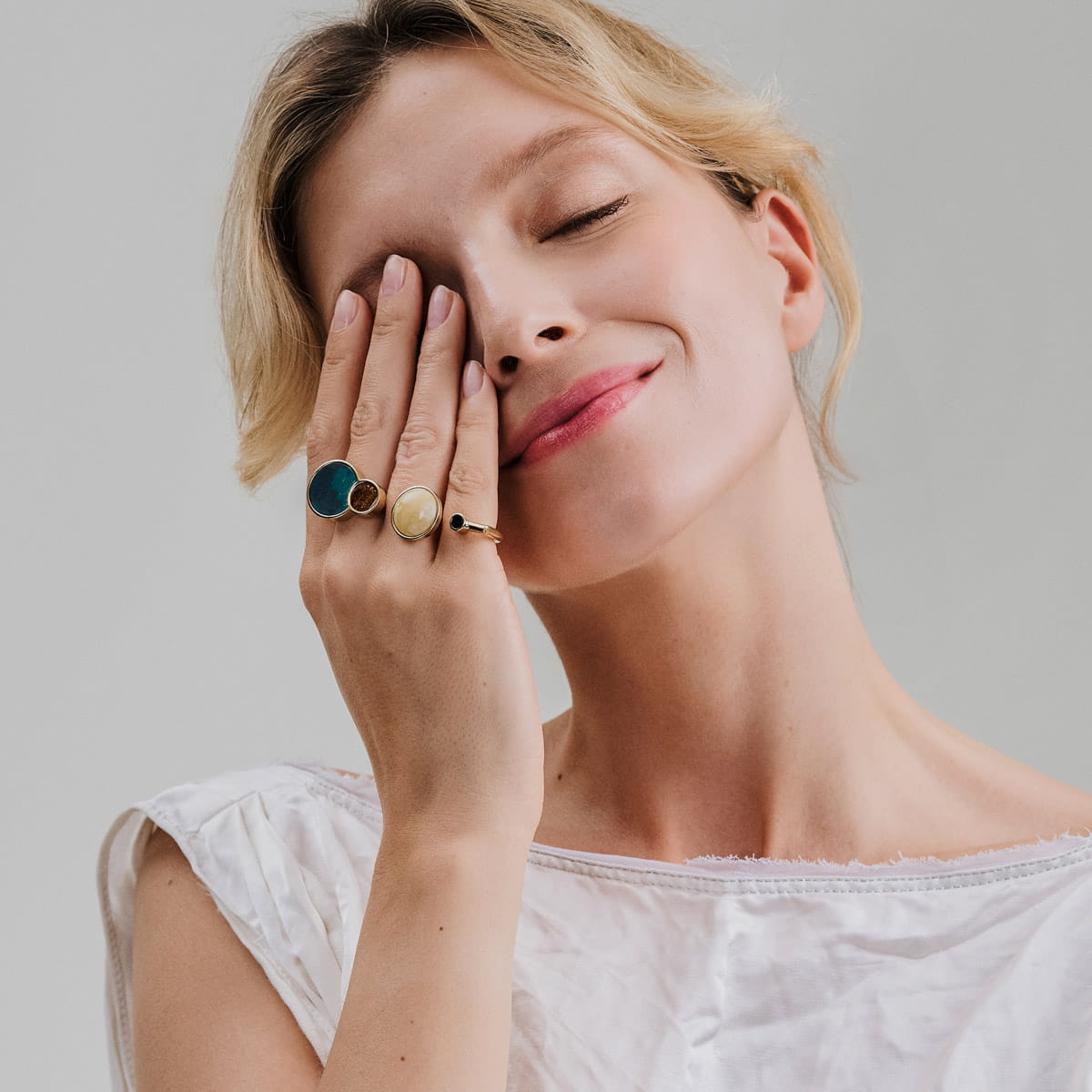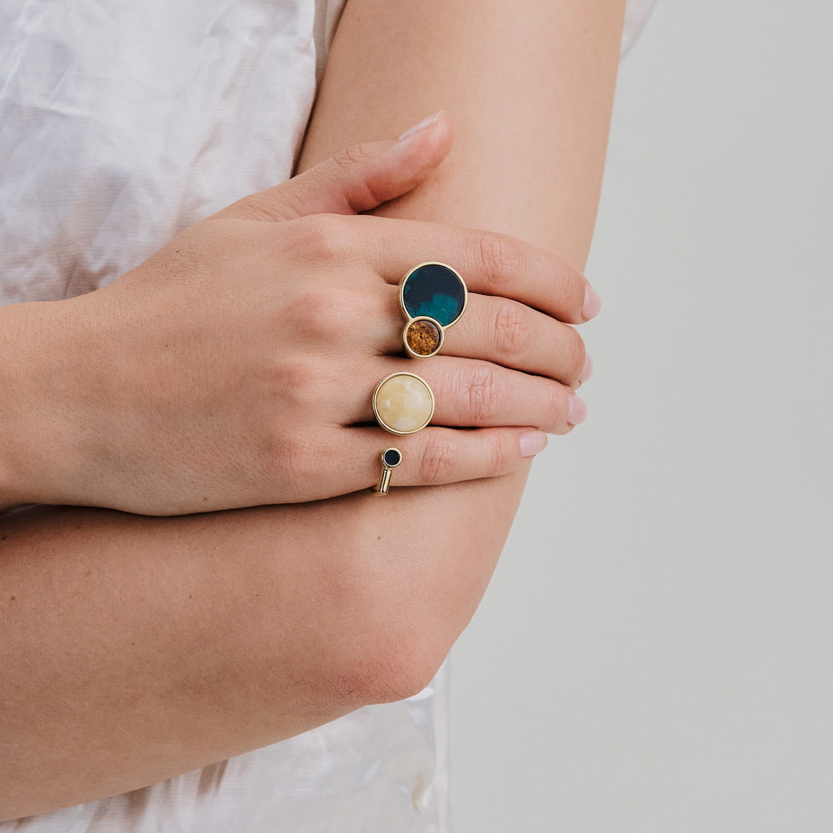 Large rings delight with their unique form and design. They are impressive and original. They are an excellent choice for evening outfits, when a striking yet classic accent is needed. The ring with a natural stone in a golden setting spreads brilliance and illuminates the entire outfit. Large rings look best paired with an elegant outfit, such as a little black dress or blazer. Glamorous rings will attract attention, so it is best to match them with delicate accessories in the form of small earrings or a necklace of the same color.