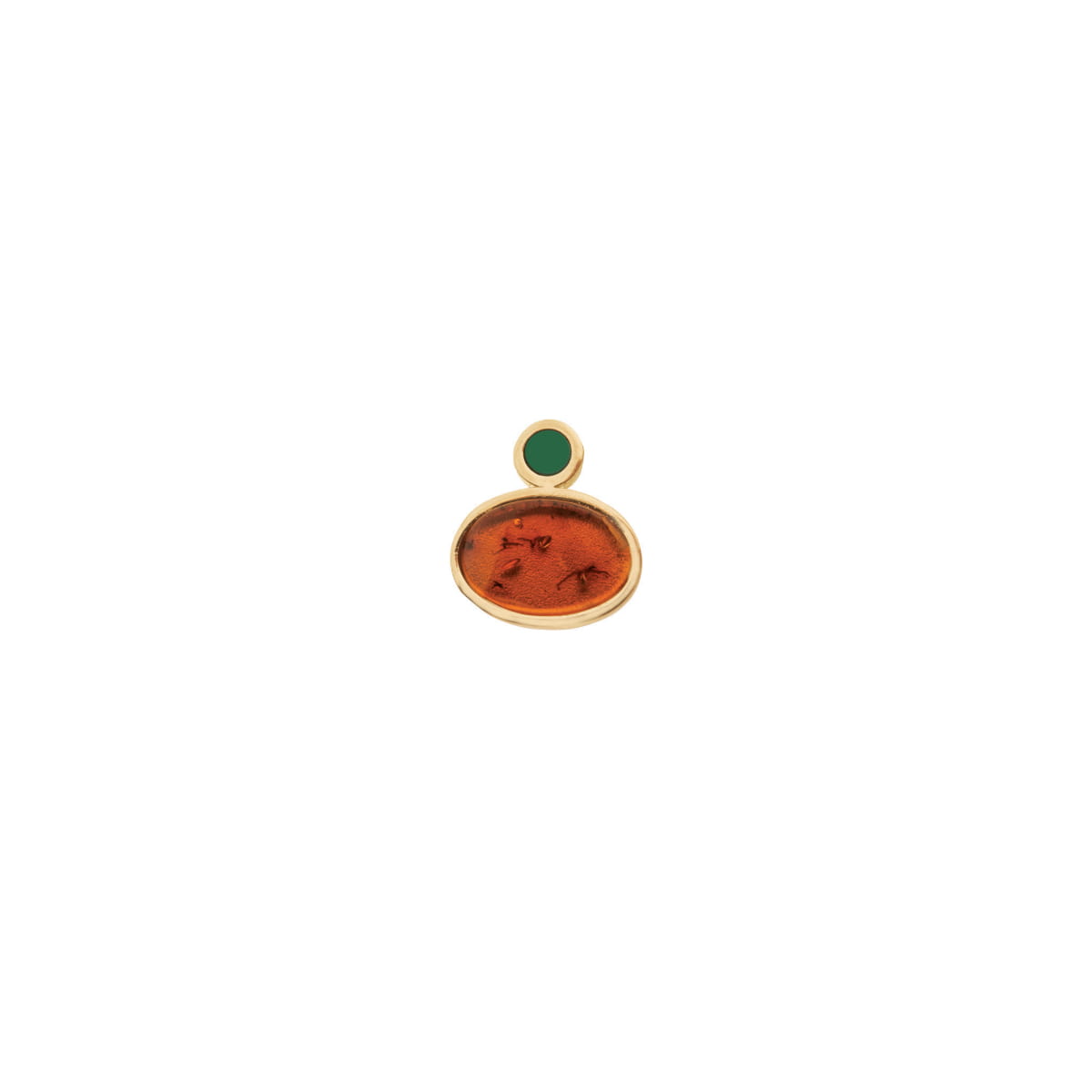 The round green stone was created in the spirit of less waste. ORSKA juxtaposed it with an oval amber in a cognac hue, which was polished in a family workshop on the Vistula Spit. The synthetic and natural stone at the ORSKA atelier was set in a satin gold-plated brass setting. Artistic jewelry with a modern design will create perfect compositions with other jewelry pieces from the Baltica collection. The earring, although sold individually, will look best in a set.