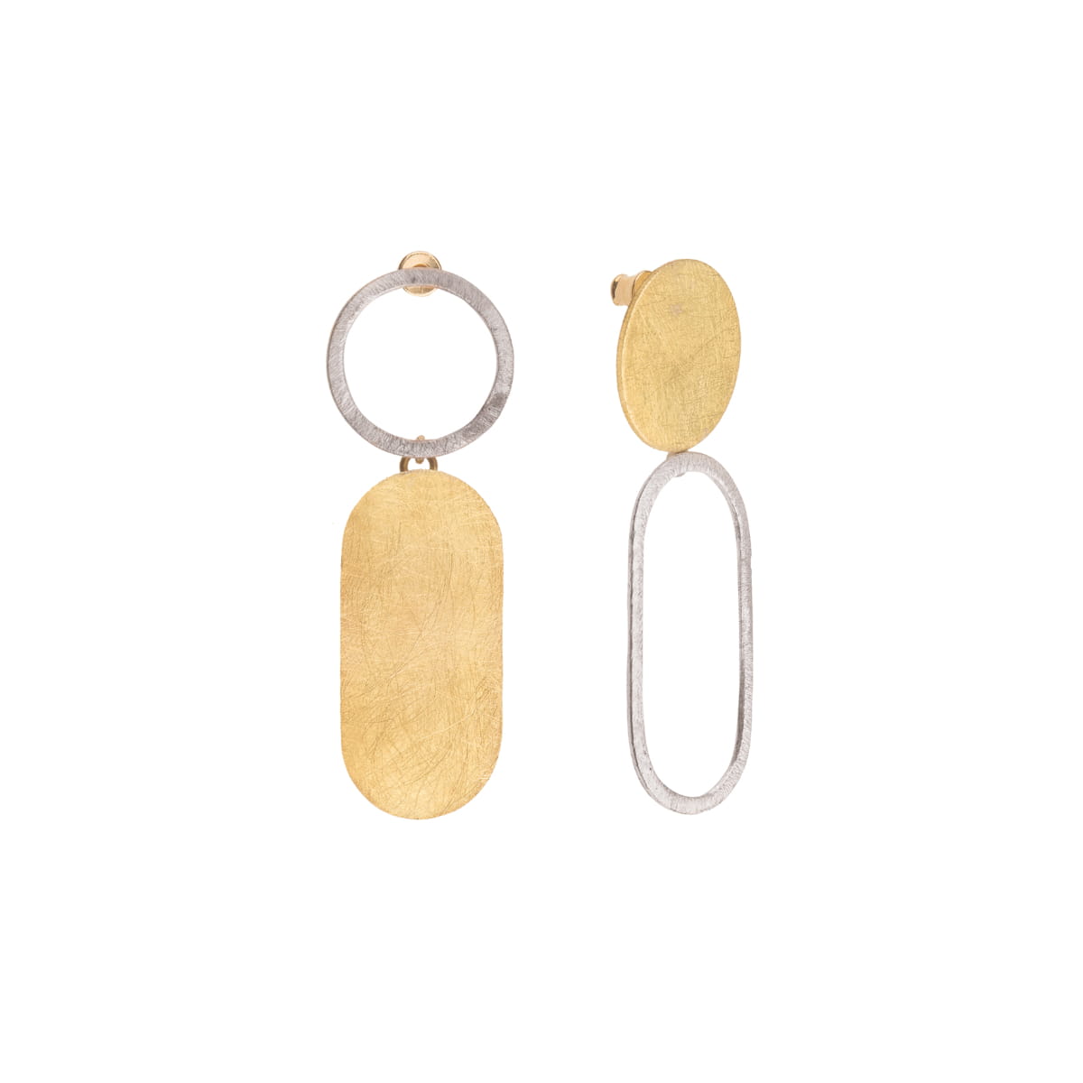 Artystyczne, niesymetryczne kolczyki na sztyfcie zostały wykonane ręcznie ze srebra oraz pozłacanego mosiądzu. Długie kolczyki dzięki uniwersalnemu charakterowi oraz połączeniu kolorów, będą świetnym uzupełnieniem wielu kreacji, zarówno codziennych jak i wieczorowych.