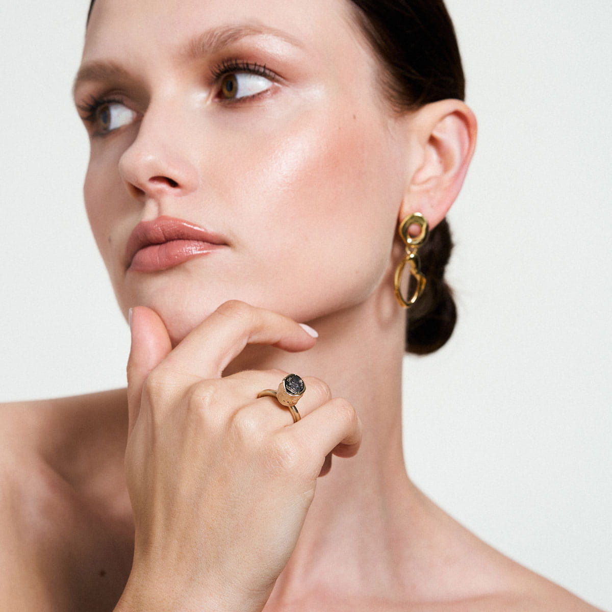 A growing concern about what we will leave behind for future generations has inspired ORSKA to develop the concept of reincarnation of post-industrial plastic, which has undergone experimental treatment. As a result of this process, a synthetic stone was created, which is the heart of the New Stone collection. The lightweight black block with rainbow-like shimmer and texture reminiscent of crystallization known from natural minerals was made of processed plastic with addition of brass filings from ORSKA jewellery studio. The impressive ring was handcrafted. The irregular shape creates an interesting form, that attracts attention.