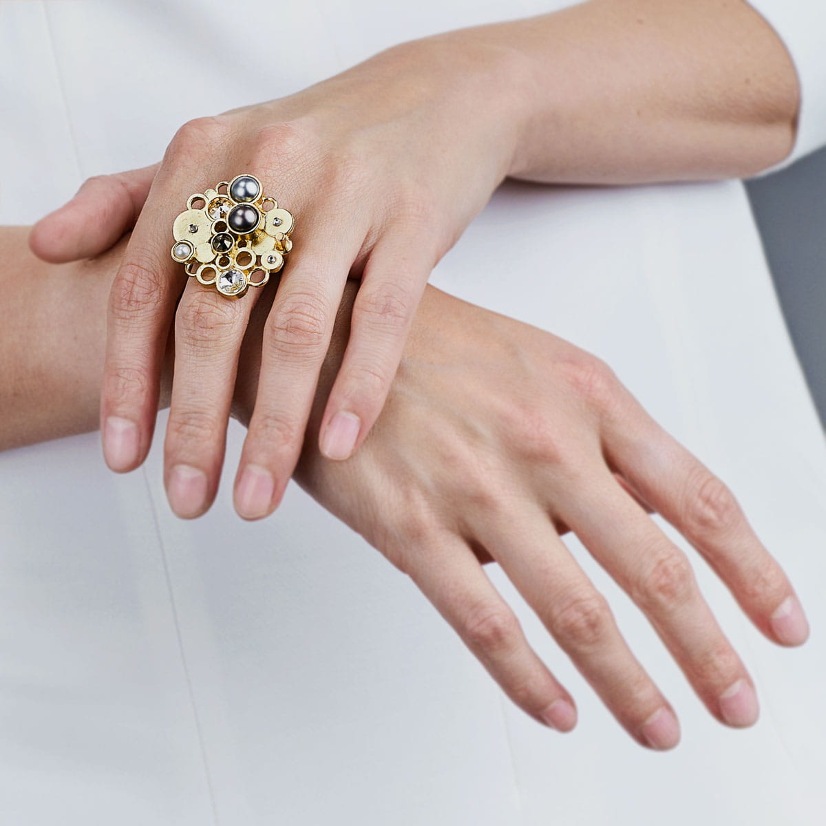 Soda collection is an innocent flirt between what is classic and what is modern. The artistic ring was carefully handcrafted from brass. The traditional, elegant band was adorned with an extraordinary element made using 3D printing technology. The brass bubbles were enriched with crystals and pearls which add a modern character to the design. The splendid jewellery will be a perfect decoration for those who look for non-obvious solutions and unique aesthetic experiences.