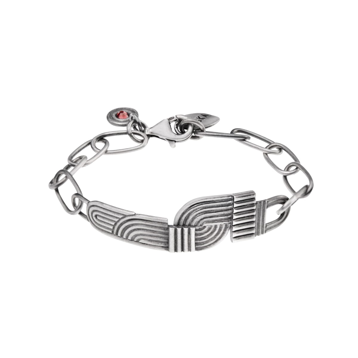 The bracelet consists of a geometric element, cast in silver, and a simple chain decorated with the ORSKA logo. The construction of the links, along with the clasp, allows it to fit comfortably on the wrist. The pendant was hand-decorated with a linear pattern. The interpretation of air is in the shape of an arc, reminiscent of the constantly flowing air, in which the lines dynamically change direction. The minimalist earth symbol, created from parallel lines, is a reference to fields seen from a bird's eye view. The water sign was inspired by a circle formed on the disturbed surface of a lake. The crystal in warm red refers to the element of fire. The symbolic cooperation of the elements encourages us to appreciate the complementary essence of nature.