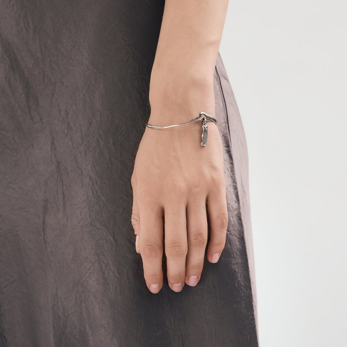 Handmade silver bracelet from the Meteoros collection is a combination of artistic craftsmanship and cosmic beauty. Inspired by the irregular shapes of celestial bodies, it consists of two half hoops that come together to form a cohesive whole. Made using the cast metal method, it impresses with a texture reminiscent of the surface of asteroids traversing the galaxy. The silver setting gently wraps the rectangular Aletai meteorite, emphasizing its uniqueness. The ORSKA logo and decorative twist clasp add subtle elegance to the piece.